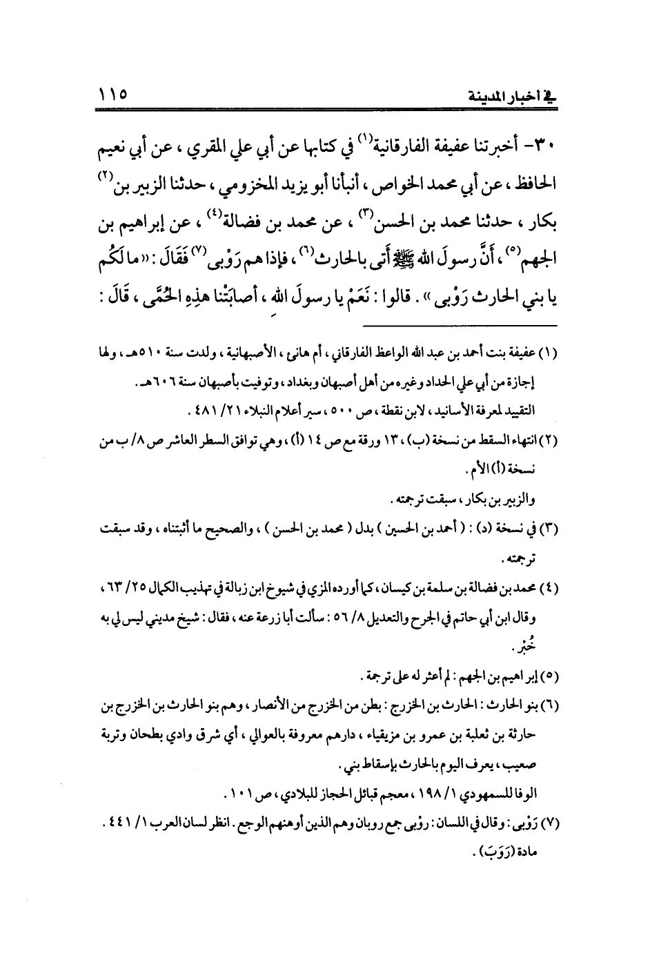 ٣٠ - أخبرتنا عفيفة الفارقانية (¬١) في كتابها عن أبي علي المقري، عن أبي نعيم الحافظ، عن أبي محمد الخواص، أنبأنا أبو يزيد المخزومي، حدثنا الزبير بن (¬٢) بكار، حدثنا محمد بن الحسن (¬٣)، عن محمد بن فضالة (¬٤)، عن إبراهيم بن الجهم (¬٥)، أَنَّ رسولَ الله صلى الله عليه وسلم أَتى بالحارث (¬٦)، فإذا هم رَوْبى (¬٧) فَقَالَ: ((ما لَكُم يا بني الحارث رَوْبى)). قالوا: نَعَمْ يا رسولَ اللهِ، أصابَتْنا هذِهِ الحُمَّى، قَالَ:
