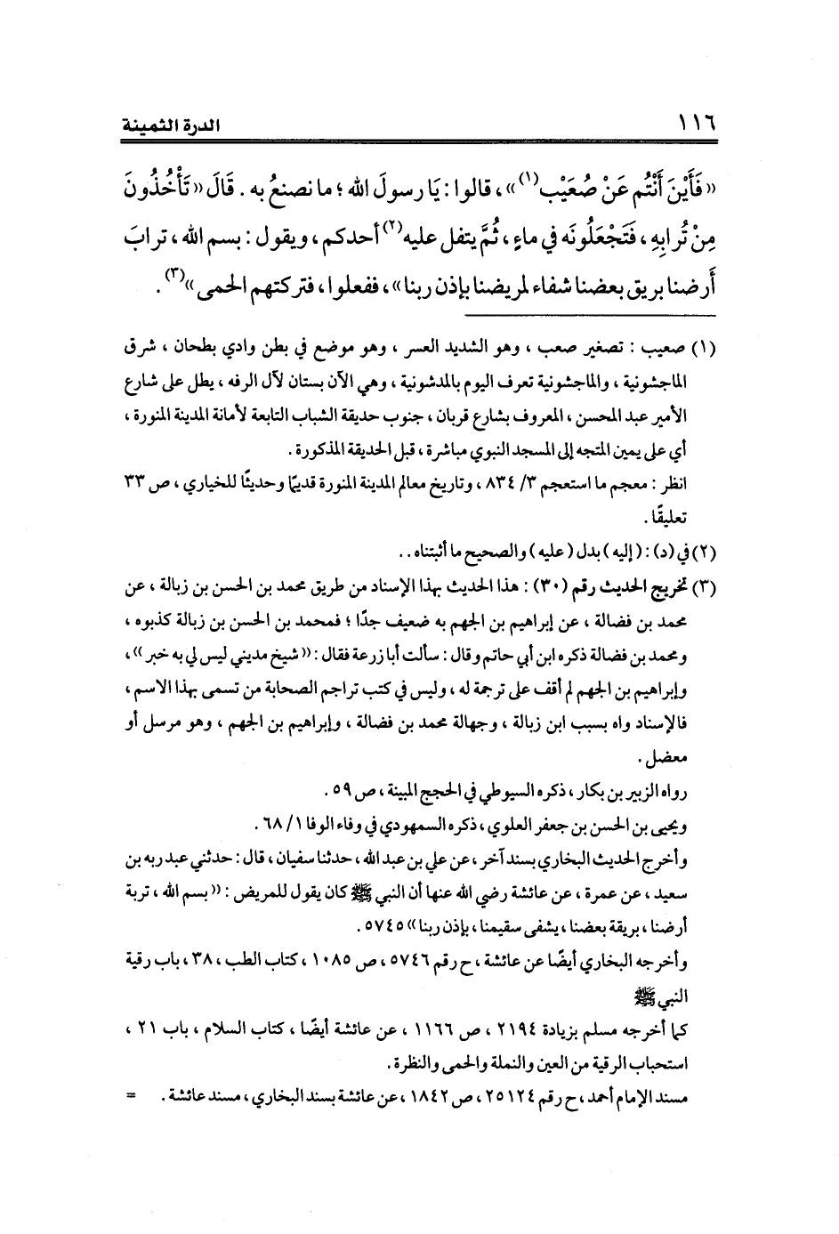 ((فَأَيْنَ أَنْتُم عَنْ صُعَيْب (¬١)))، قالوا: يَا رسولَ الله؛ ما نصنعُ به. قَالَ ((تَأْخُذُونَ مِنْ تُرابِهِ، فَتَجْعَلُونَه في ماءٍ، ثُمَّ يتفل عليه (¬٢) أحدكم، ويقول: بسم الله، ترابَ أَرضنا بريق بعضنا شفاء لمريضنا بإذن ربنا))، ففعلوا، فتركتهم الحمى)) (¬٣)