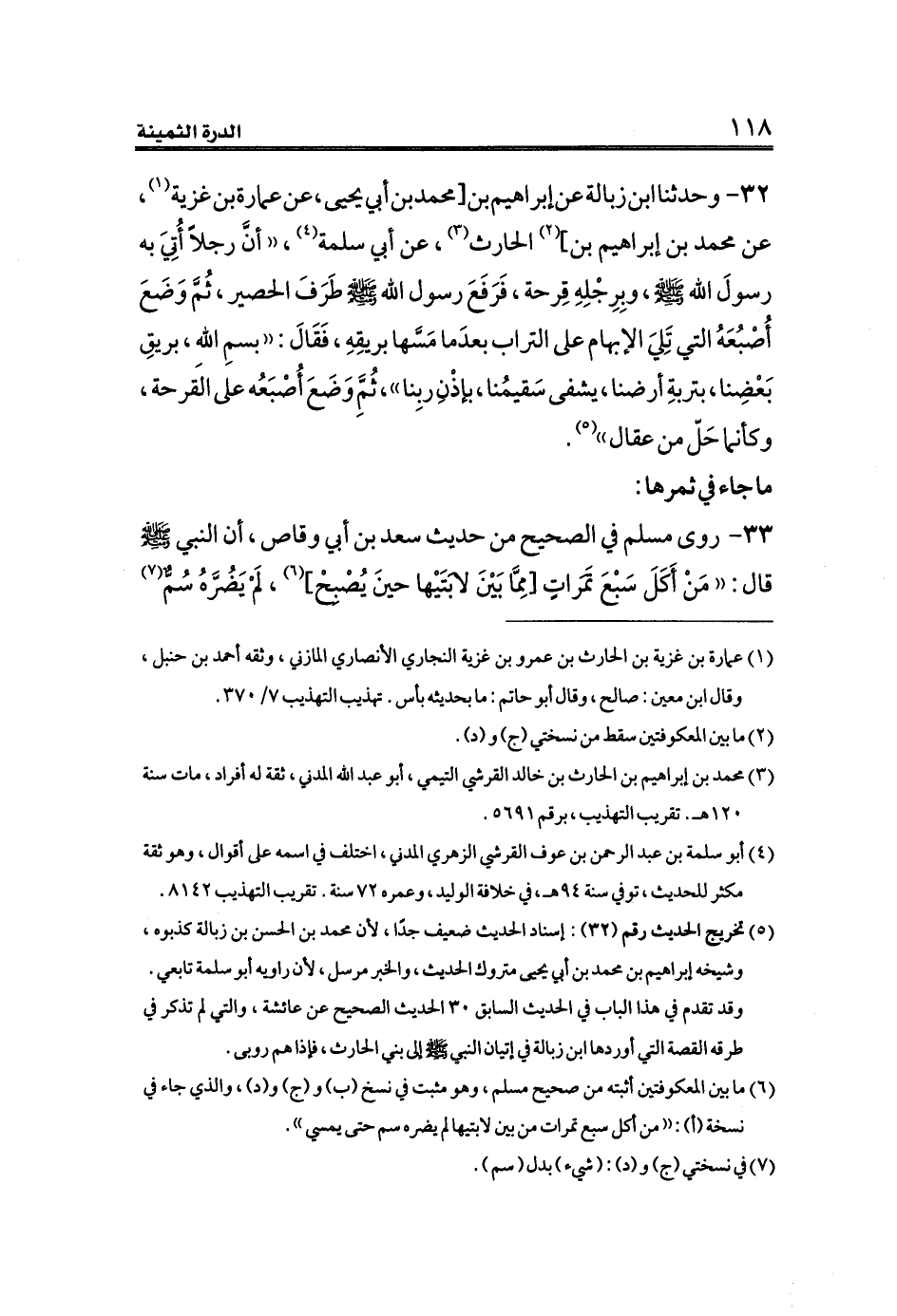 ٣٣ - روى مسلم في الصحيح من حديث سعد بن أبي وقاص، أن النبي صلى الله عليه وسلم قال: ((مَنْ أَكَلَ سَبْعَ تَمَراتٍ [مِمَّا بَيْنَ لابَتَيْها حينَ يُصْبِحْ] (¬٦)، لَمْ يَضُرَّهُ سُمٌّ (¬٧)