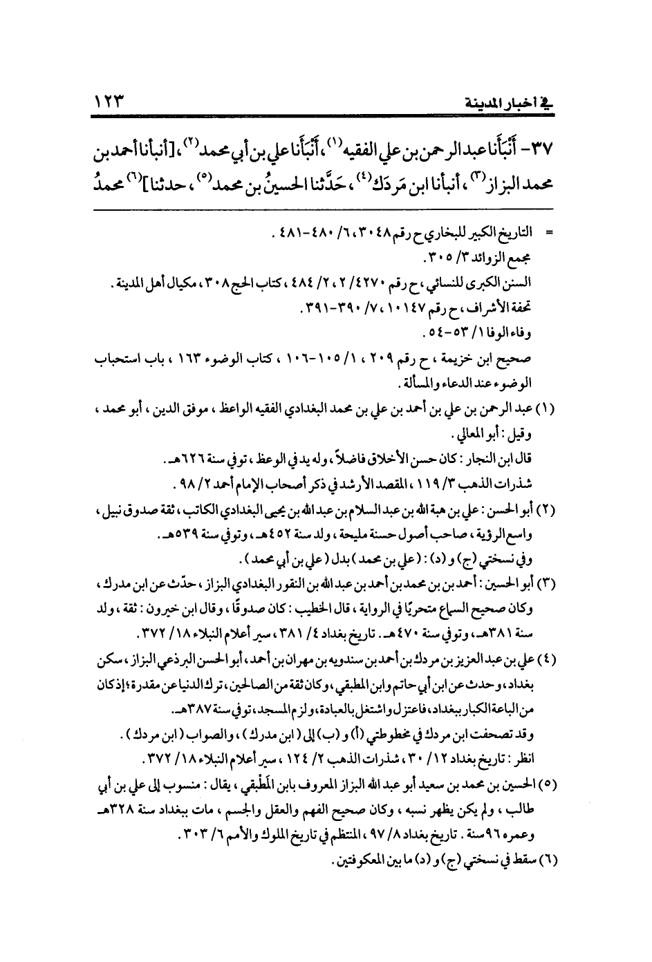 ٣٧ - أَنْبَأَنا عبد الرحمن بن علي الفقيه (¬١)، أَنْبَأَنا علي بن أبي محمد (¬٢)، [أنبأنا أحمد بن محمد البزاز (¬٣)، أنبأنا ابن مَردَك (¬٤)، حَدَّثنا الحسينُ بن محمد (¬٥)، حدثنا] (¬٦) محمدُ