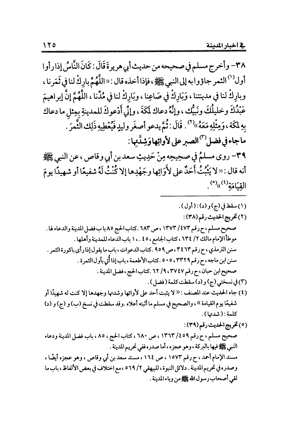 ٣٩ - روى مسلمُ في صحِيحِه مِنْ حَدِيثِ سعد بن أبي وقاص، عن النبي الله صلى الله عليه وسلم أنه قال: ((لا يَثْبُتُ أَحَدٌ على لأَوَائِها وجَهْدِها إلا كُنْتُ لَهُ شفيعًا أو شهيدًا يومَ القِيَامَةِ (¬٤))) (¬٥)