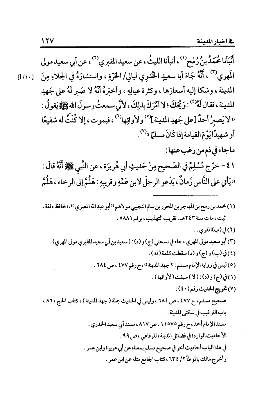 أَنْبَأنا مُحَمّدُ بنُ رُمْح (¬١)، أنبأنا الليثُ، عن سعيد المقبري (¬٢)، عن أبي سعيد مولى المَهري (¬٣)، أَنَّهُ جَاءَ أبا سعيدٍ الخُدرِي ليالي [١٠/أ] الحَرّةِ، واستشارَهُ في الجلاءِ مِنَ المدينة، وشكا إليه أسعارَها، وكثرة عيالِهِ، وأخبَرهُ أنّهُ لا صَبر لَهُ على جَهدِ المدينة، فقال لَهُ (¬٤): وَيْحَكَ؛ لا آمُرَكَ بذلِكَ، لأنَّي سمعتُ رسولَ اللهِ صلى الله عليه وسلم يَقولُ: ((لا يَصبِرُ أحدٌ [على جَهدِ المدينة] (¬٥) ولأوائِها (¬٦)، فيموت، إلا كُنْتُ له شفيعًا أو شهيدًا يَوْمَ القيامة إذا كَانَ مسلمًا)) (¬٧)