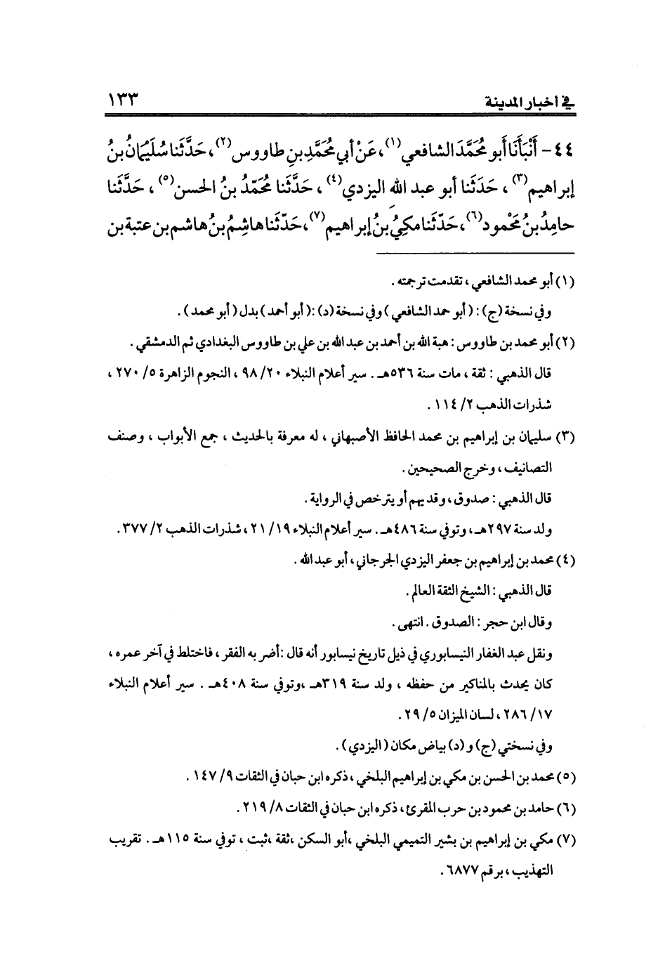 ٤٤ - أَنْبَأَنَا أَبو مُحَمَّدَ الشافعي (¬١)، عَنْ أبي مُحَمَّدِ بنِ طاووس (¬٢)، حَدَّثَنا سُلَيْمَانُ بنُ إبراهيم (¬٣)، حَدَثَنا أبو عبد اللهِ اليزدي (¬٤)، حَدَّثَنا مُحَمّدُ بنُ الحسن (¬٥)، حَدَّثَنا حامِدُ بنُ مَحْمود (¬٦)، حَدّثَنا مكِيُ بنُ إبراهيم (¬٧)، حَدّثَنا هاشِمُ بنُ هاشم بن عتبة بن