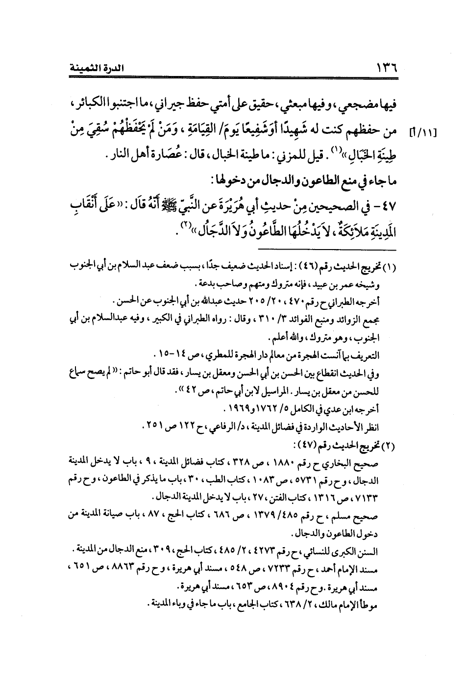 صحيح البخاري ح رقم ١٨٨٠، ص ٣٢٨، كتاب فضائل المدينة، ٩، باب لا يدخل المدينة الدجال، و ح رقم ٥٧٣١، ص ١٠٨٣، كتاب الطب، ٣٠، باب ما يذكر في الطاعون، و ح رقم ٧١٣٣، ص ١٣١٦، كتاب الفتن، ٢٧، باب لا يدخل المدينة الدجال.