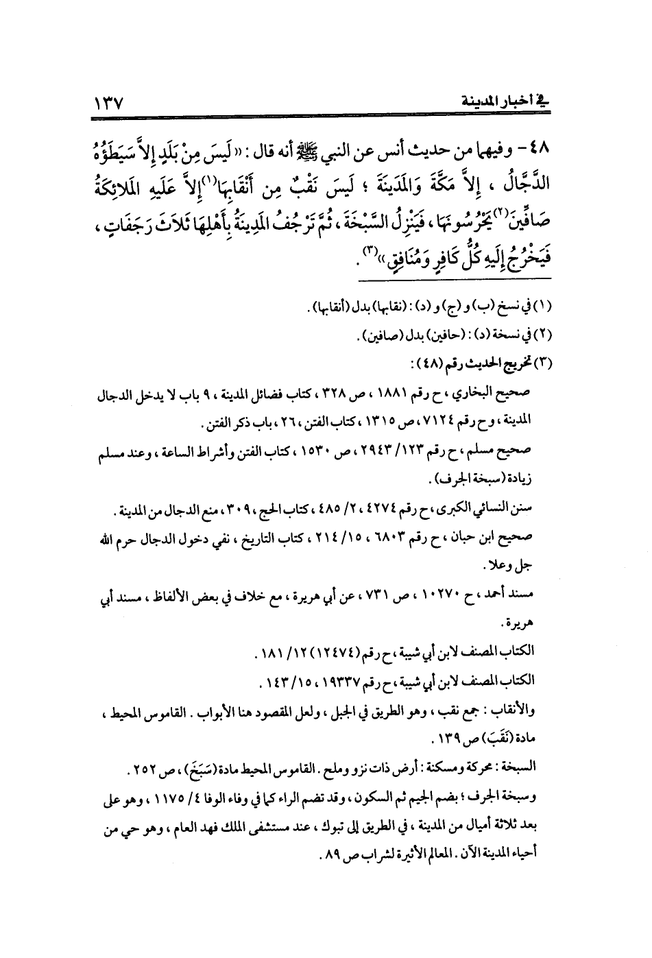 صحيح البخاري، ح رقم ١٨٨١، ص ٣٢٨، كتاب فضائل المدينة، ٩ باب لا يدخل الدجال المدينة، و ح رقم ٧١٢٤، ص ١٣١٥، كتاب الفتن، ٢٦، باب ذكر الفتن.