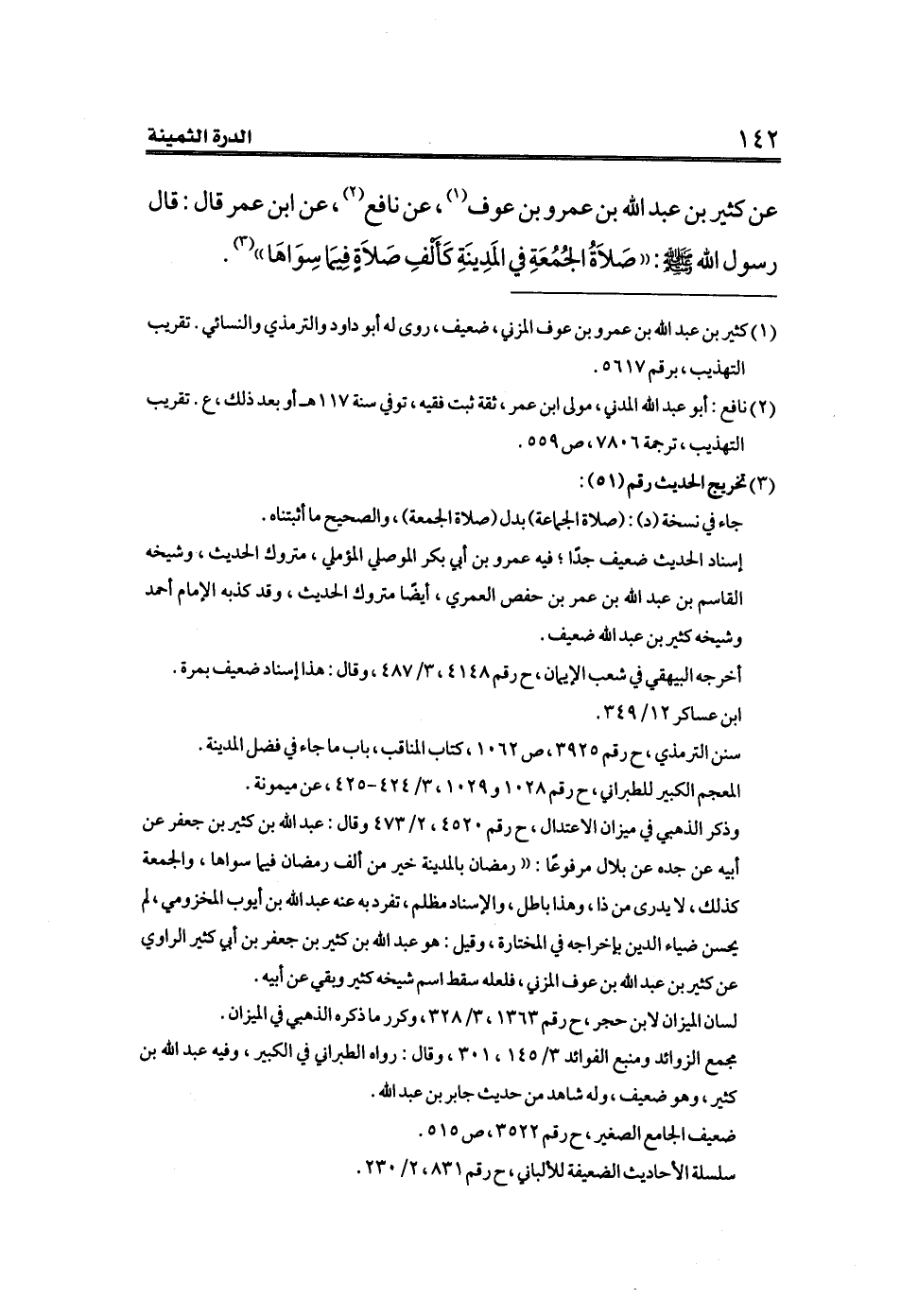 عن كثير بن عبد الله بن عمرو بن عوف (¬١)، عن نافع (¬٢)، عن ابن عمر قال: قال رسول الله صلى الله عليه وسلم: ((صَلَاةُ الجُمُعَةِ في المَدِينَةِ كَأَلْفِ صَلَاةٍ فِيمَا سِوَاهَا)) (¬٣).