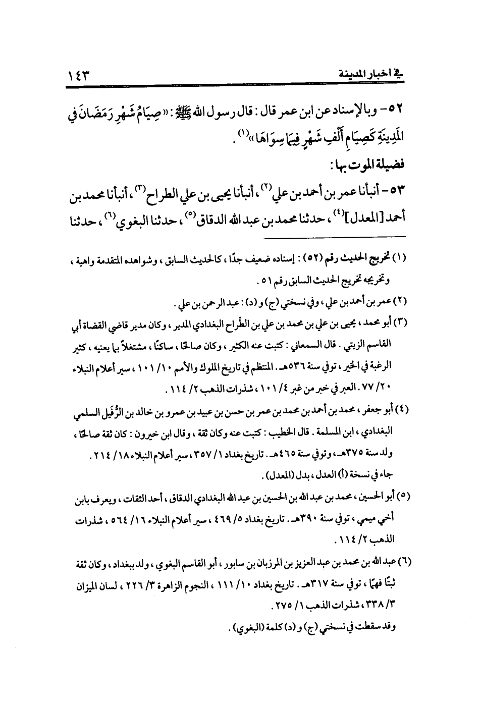 ٥٢ - وبالإسناد عن ابن عمر قال: قال رسول الله صلى الله عليه وسلم: ((صِيَامُ شَهْرِ رَمَضَانَ في المَدِينَةِ كَصِيَامِ أَلْفِ شَهْرٍ فِيمَا سِوَاهَا)) (¬١).