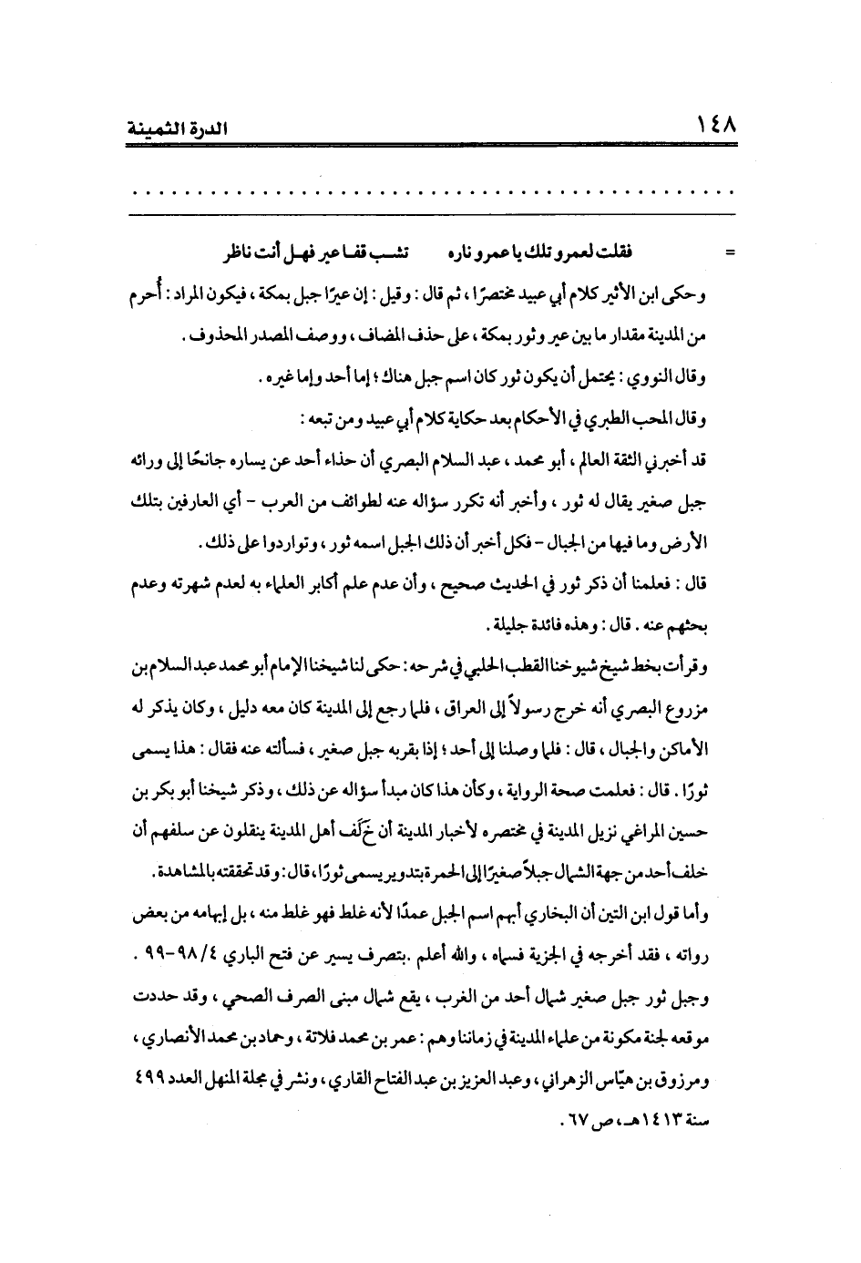 وقرأت بخط شيخ شيوخنا القطب الحلبي في شرحه: حكى لنا شيخنا الإمام أبو محمد عبد السلام بن مزروع البصري أنه خرج رسولاً إلى العراق، فلما رجع إلى المدينة كان معه دليل، وكان يذكر له الأماكن والجبال، قال: فلما وصلنا إلى أحد؛ إذا بقربه جبل صغير، فسألته عنه فقال: هذا يسمى ثورًا. قال: فعلمت صحة الرواية، وكأن هذا كان مبدأ سؤاله عن ذلك، وذكر شيخنا أبو بكر بن حسين المراغي نزيل المدينة في مختصره لأخبار المدينة أن خَلَف أهل المدينة ينقلون عن سلفهم أن خلف أحد من جهة الشمال جبلاً صغيرًا إلى الحمرة بتدوير يسمى ثورًا، قال: وقد تحققته بالمشاهدة.