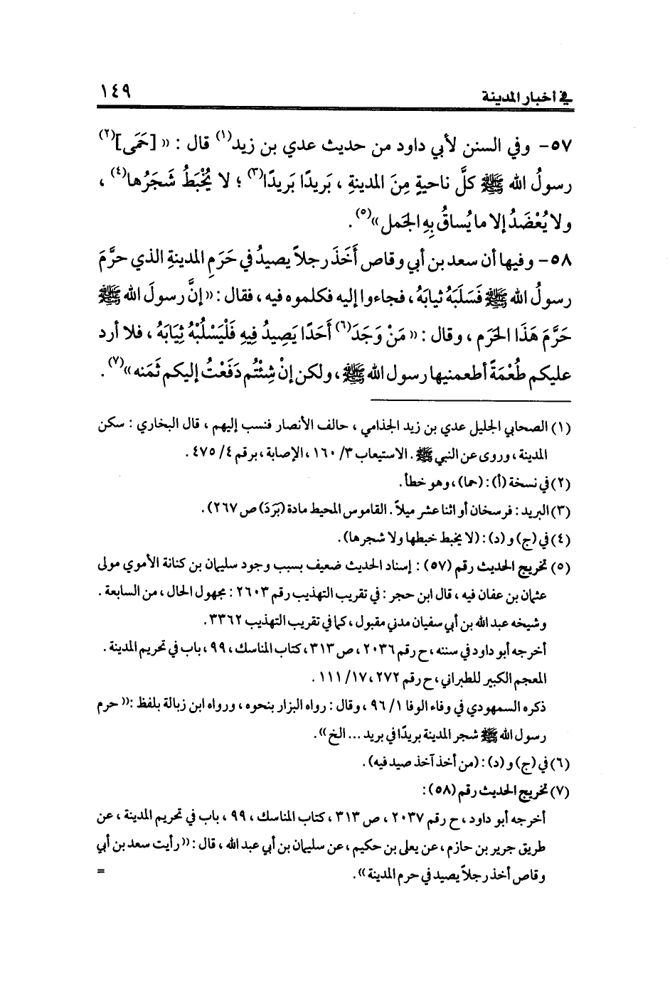 أخرجه أبو داود، ح رقم ٢٠٣٧، ص ٣١٣، كتاب المناسك، ٩٩، باب في تحريم المدينة، عن طريق جرير بن حازم، عن يعلى بن حكيم، عن سليمان بن أبي عبد الله، قال: ((رأيت سعد بن أبي وقاص أخذ رجلاً يصيد في حرم المدينة)) ................ =