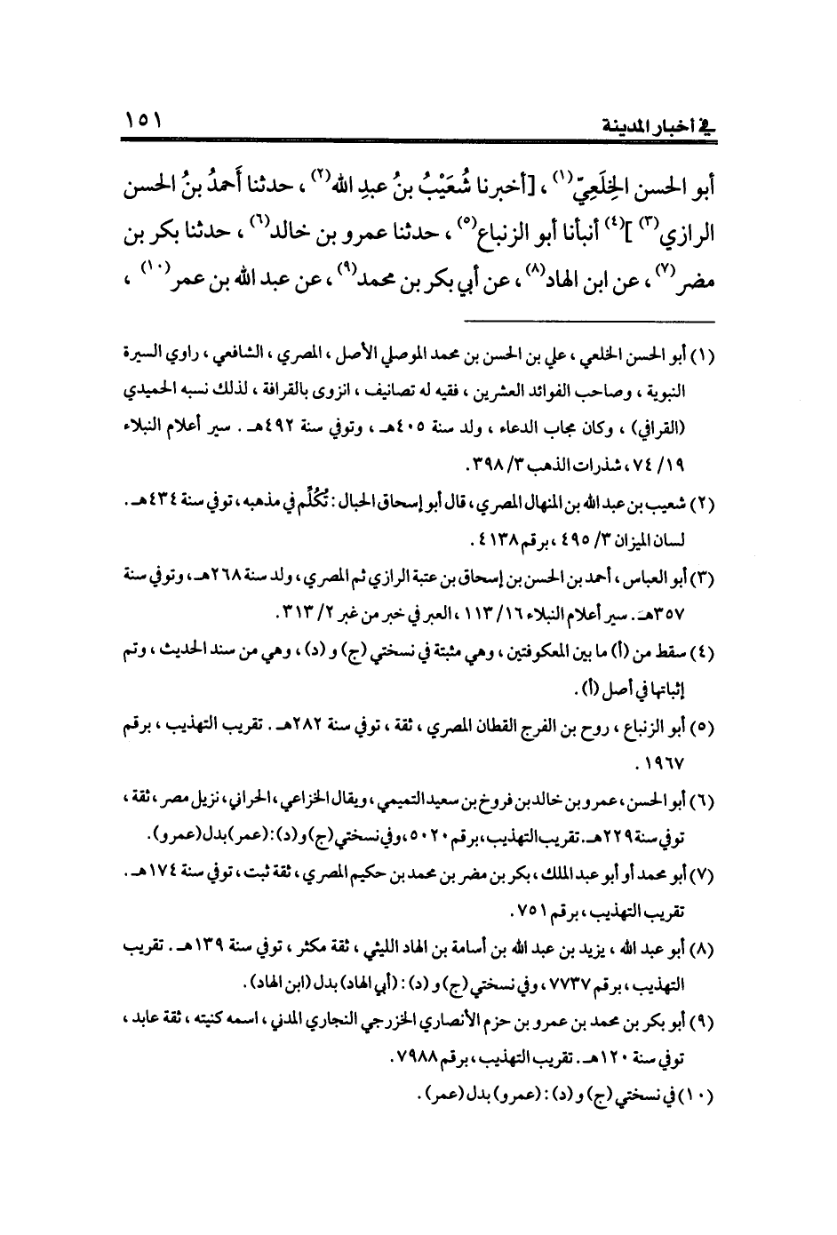 (¬٢) شعيب بن عبد الله بن المنهال المصري، قال أبو إسحاق الحبال: تُكُلِّم في مذهبه، توفي سنة ٤٣٤ هـ. لسان الميزان ٣/ ٤٩٥، برقم ٤١٣٨.