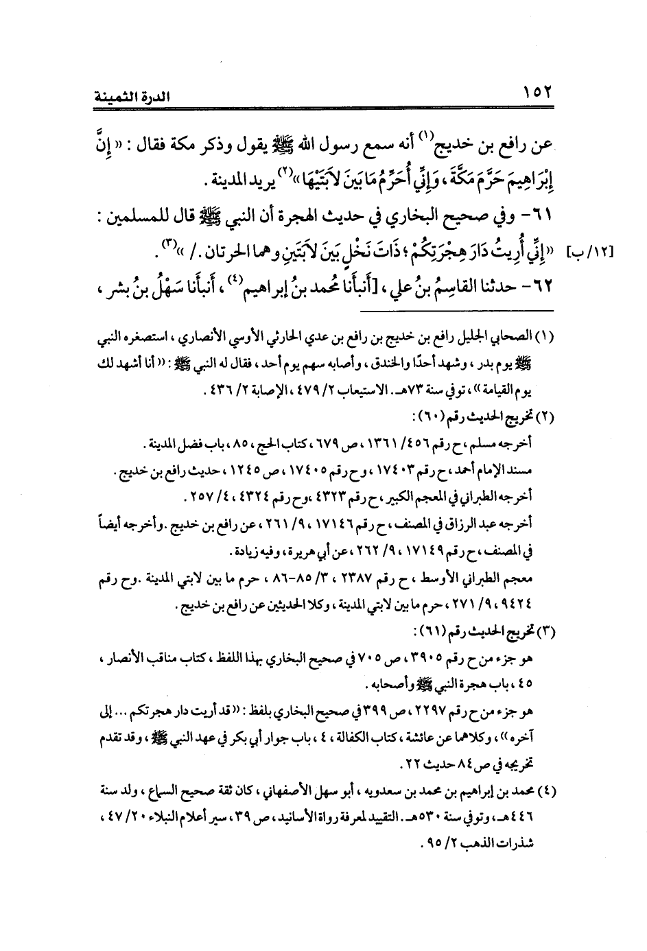 (¬١) الصحابي الجليل رافع بن خديج بن رافع بن عدي الحارثي الأوسي الأنصاري، استصغره النبي الله صلى الله عليه وسلم يوم بدر، وشهد أحدًا والخندق، وأصابه سهم يوم أحد، فقال له النبي الله صلى الله عليه وسلم: ((أنا أشهد لك يوم القيامة))، توفي سنة ٧٣ هـ. الاستيعاب ٢/ ٤٧٩، الإصابة ٢/ ٤٣٦.