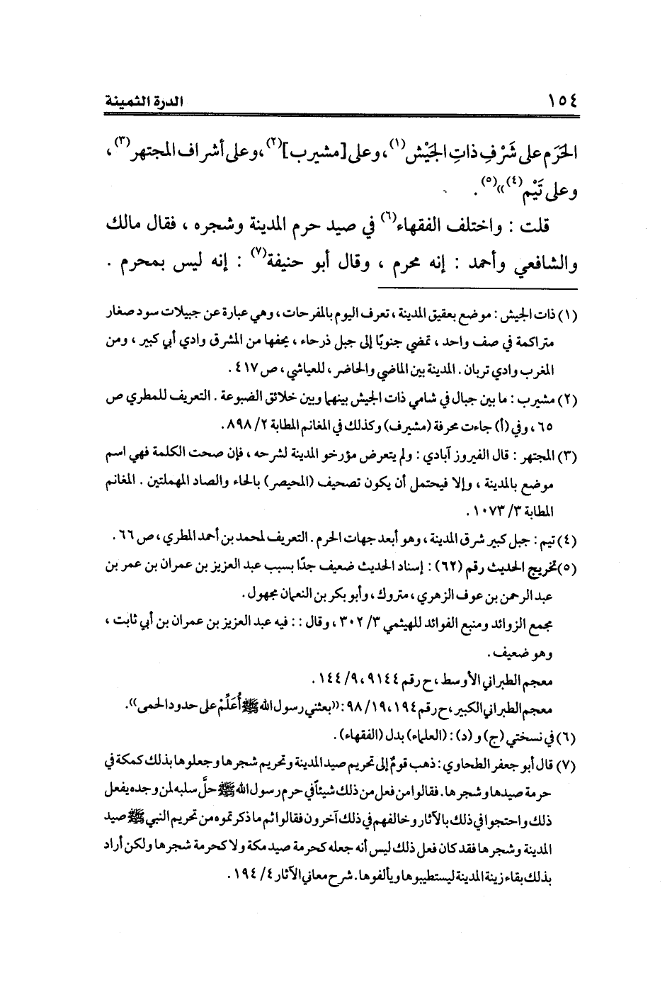 (¬٧) قال أبو جعفر الطحاوي: ذهب قومٌ إلى تحريم صيد المدينة وتحريم شجرها وجعلوها بذلك كمكة في حرمة صيدها وشجرها. فقالوا من فعل من ذلك شيئاً في حرم رسول الله صلى الله عليه وسلم حلَّ سلبه لمن وجده يفعل ذلك واحتجوا في ذلك بالآثار وخالفهم في ذلك آخرون فقالوا ثم ما ذكرتموه من تحريم النبي الله صلى الله عليه وسلم صيد المدينة وشجرها فقد كان فعل ذلك ليس أنه جعله كحرمة صيد مكة ولا كحرمة شجرها ولكن أراد بذلك بقاء زينة المدينة ليستطيبوها ويألفوها. شرح معاني الآثار ٤/ ١٩٤.