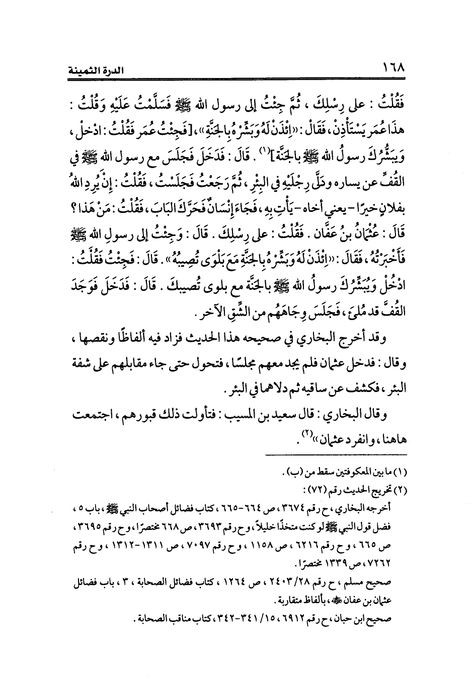 صحيح مسلم، ح رقم ٢٨/ ٢٤٠٣، ص ١٢٦٤، كتاب فضائل الصحابة، ٣، باب فضائل عثمان بن عفان - رضي الله عنه -، بألفاظ متقاربة.
