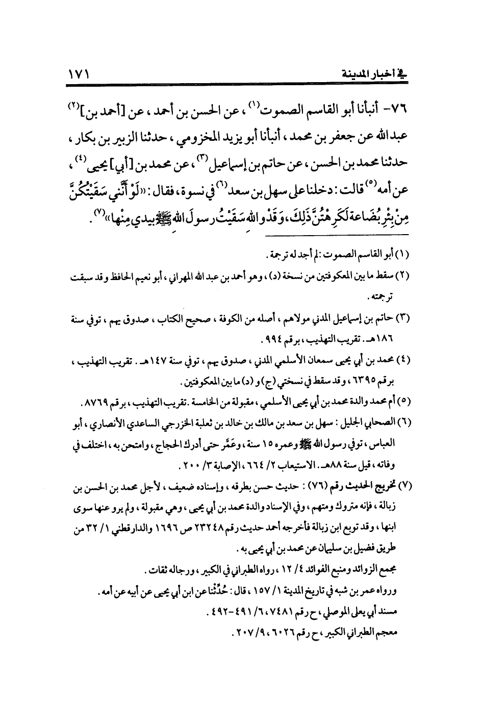 ٧٦ - أنبأنا أبو القاسم الصموت (¬١)، عن الحسن بن أحمد، عن [أحمد بن] (¬٢) عبد الله عن جعفر بن محمد، أنبأنا أبو يزيد المخزومي، حدثنا الزبير بن بكار، حدثنا محمد بن الحسن، عن حاتم بن إسماعيل (¬٣)، عن محمد بن [أبي] يحيى (¬٤)، عن أمه (¬٥) قالت: دخلنا على سهل بن سعد (¬٦) في نسوة، فقال: ((لَوْ أَنَّني سَقَيْتُكُنَّ مِنْ بِئْرِ بُضَاعة لَكَرِهْتُنَّ ذَلِكَ، وَقَدْ واللهِ سَقَيْتُ رسولَ اللهِ صلى الله عليه وسلم بيدي مِنْها)) (¬٧)