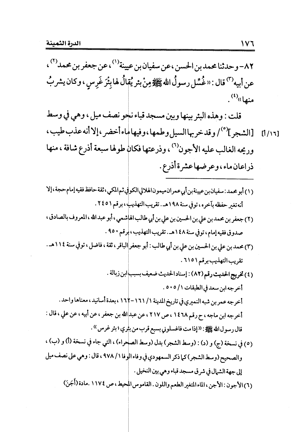 ٨٢ - وحدثنا محمد بن الحسن، عن سفيان بن عيينة (¬١)، عن جعفر بن محمد (¬٢)، عن أبيه (¬٣) قال: ((غُسِّل رسولُ الله صلى الله عليه وسلم مِنْ بئر يُقالُ لها بِئْرَ غَرِسٍ، وكان يشربُ منها)) (¬٤)