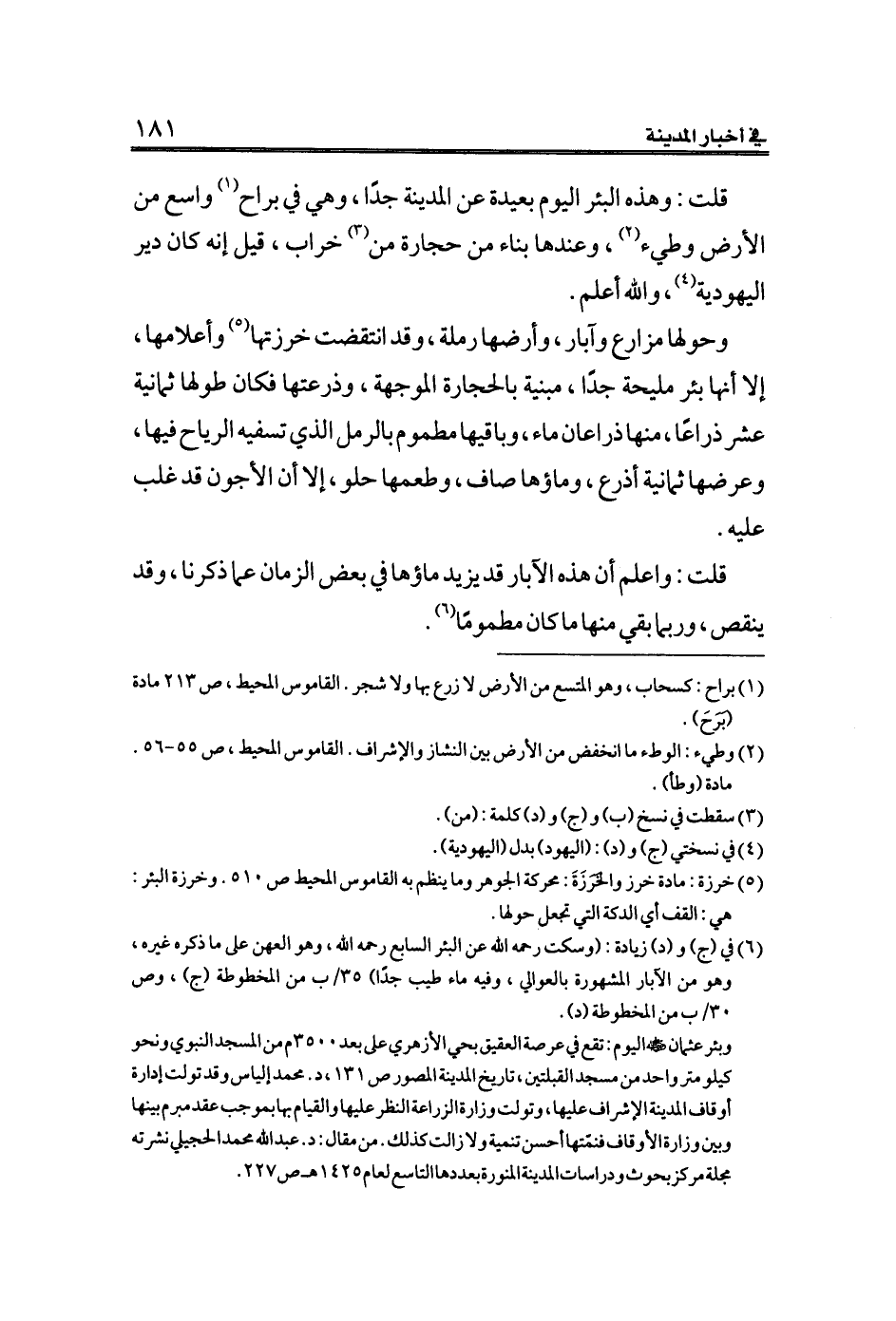(¬٦) في (ج) و (د) زيادة: (وسكت رحمه الله عن البئر السابع رحمه الله، وهو العهن على ما ذكره غيره، وهو من الآبار المشهورة بالعوالي، وفيه ماء طيب جدًا) ٣٥/ب من المخطوطة (ج)، وص ٣٠/ب من المخطوطة (د).