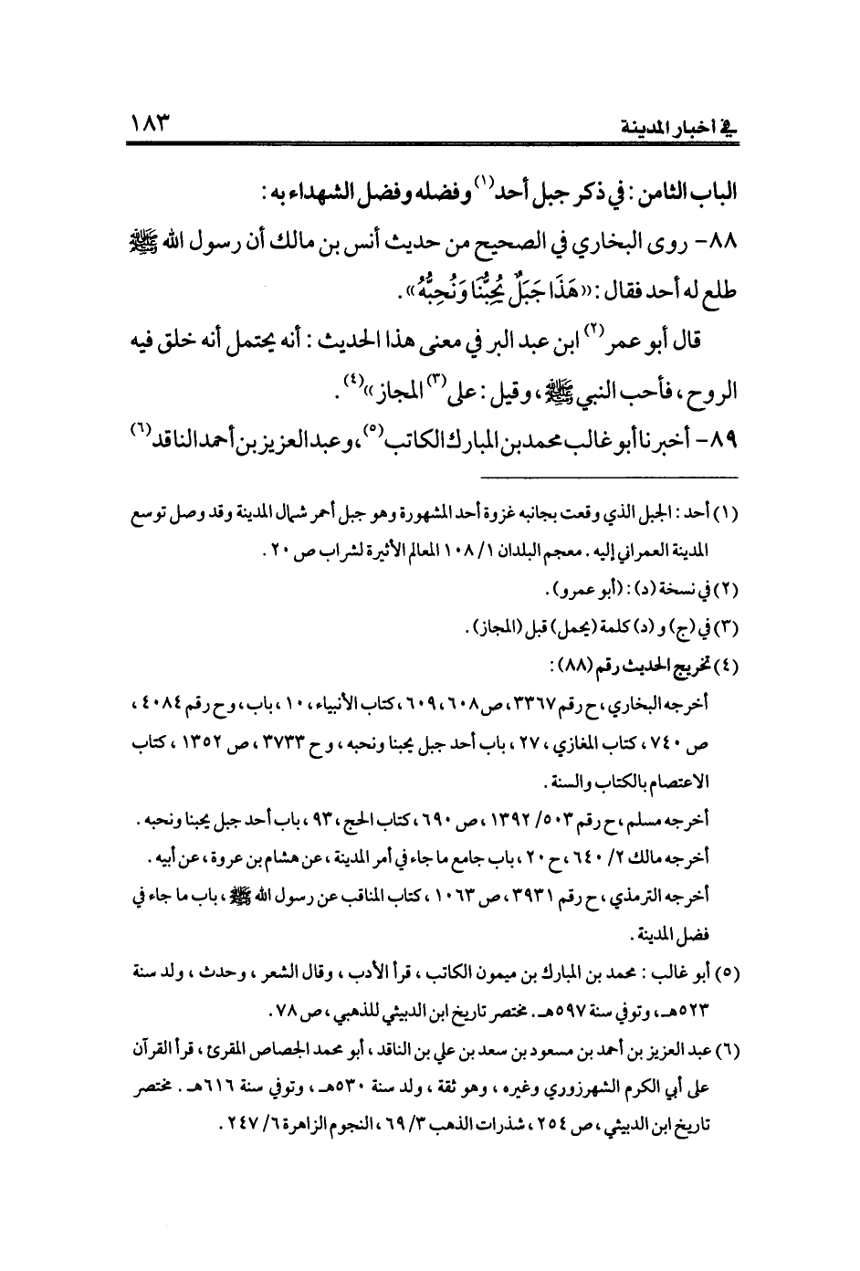 (¬١) أحد: الجبل الذي وقعت بجانبه غزوة أحد المشهورة وهو جبل أحمر شمال المدينة وقد وصل توسع المدينة العمراني إليه. معجم البلدان ١/ ١٠٨ المعالم الأثيرة لشراب ص ٢٠.