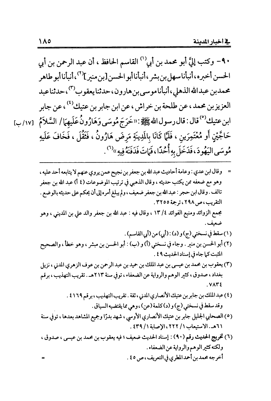 (¬٦) تخريج الحديث رقم (٩٠): إسناد الحديث ضعيف؛ فيه يعقوب بن محمد بن عيسى، صدوق، ولكنه كثير الوهم والرواية عن الضعفاء.