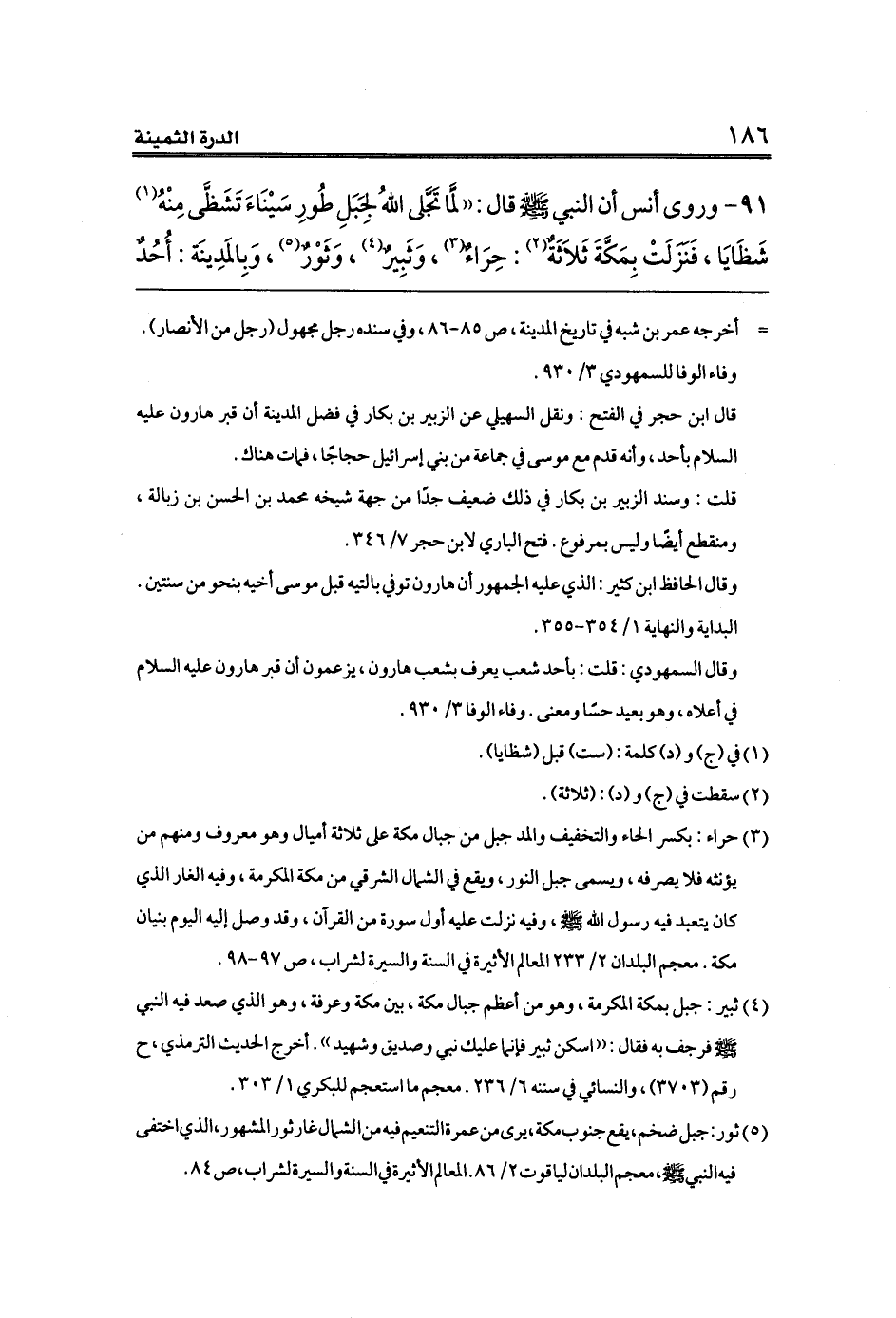 ٩١ - وروى أنس أن النبي الله صلى الله عليه وسلم قال: ((لَمَّا تَجَّلى اللهُ لِجَبَلِ طُورِ سَيْنَاءَ تَشَظَّى مِنْهُ (¬١) شَظَايَا، فَنَزَلَتْ بِمَكَّةَ ثَلَاثَةٌ (¬٢): حِرَاءٌ (¬٣)، وَثَبِيرٌ (¬٤)، وَثَوْرٌ (¬٥)، وَبِالمَدِينَة: أُحُدٌ