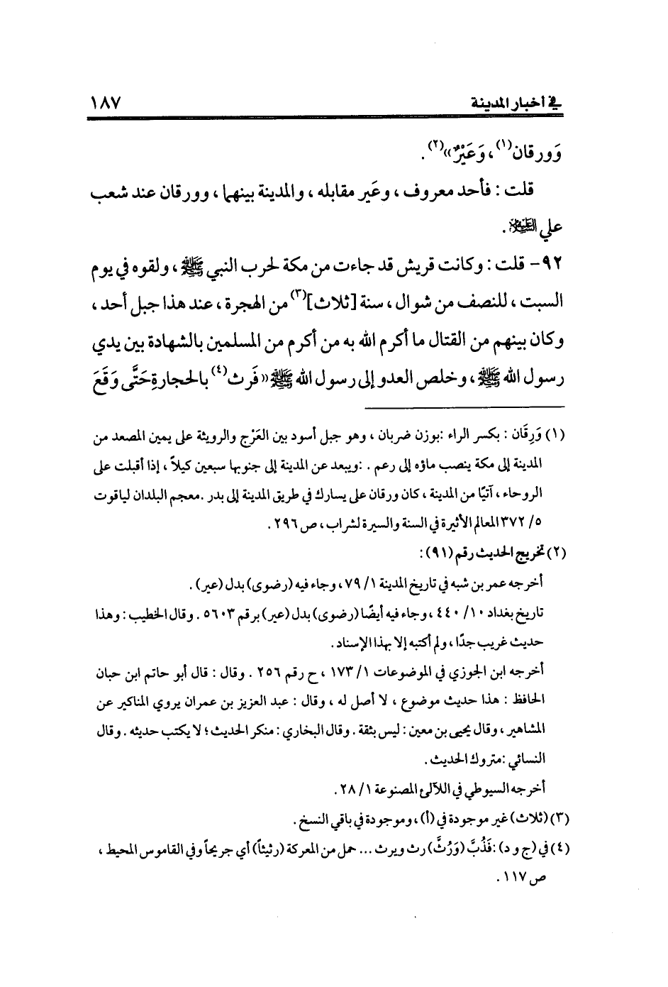 (¬١) وَرِقَان: بكسر الراء: بوزن ضربان، وهو جبل أسود بين العَرْج والرويثة على يمين المصعد من المدينة إلى مكة ينصب ماؤه إلى رعم.:ويبعد عن المدينة إلى جنوبها سبعين كيلاً، إذا أقبلت على الروحاء، آتيًا من المدينة، كان ورقان على يسارك في طريق المدينة إلى بدر. معجم البلدان لياقوت ٥/ ٣٧٢ المعالم الأثيرة في السنة والسيرة لشراب، ص ٢٩٦.