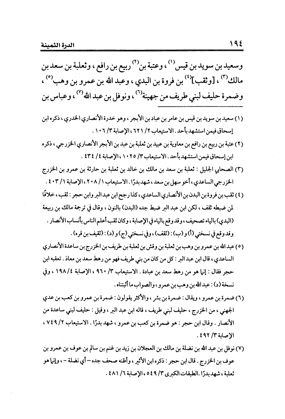(¬٣) الصحابي الجليل: ثعلبة بن سعد بن مالك بن خالد بن ثعلبة بن حارثة بن عمرو بن الخزرج الخزرجي الساعدي، أخو سهل بن سعد، شهد بدرًا. الاستيعاب ١/ ٢٠٨، الإصابة ١/ ٤٠٣.