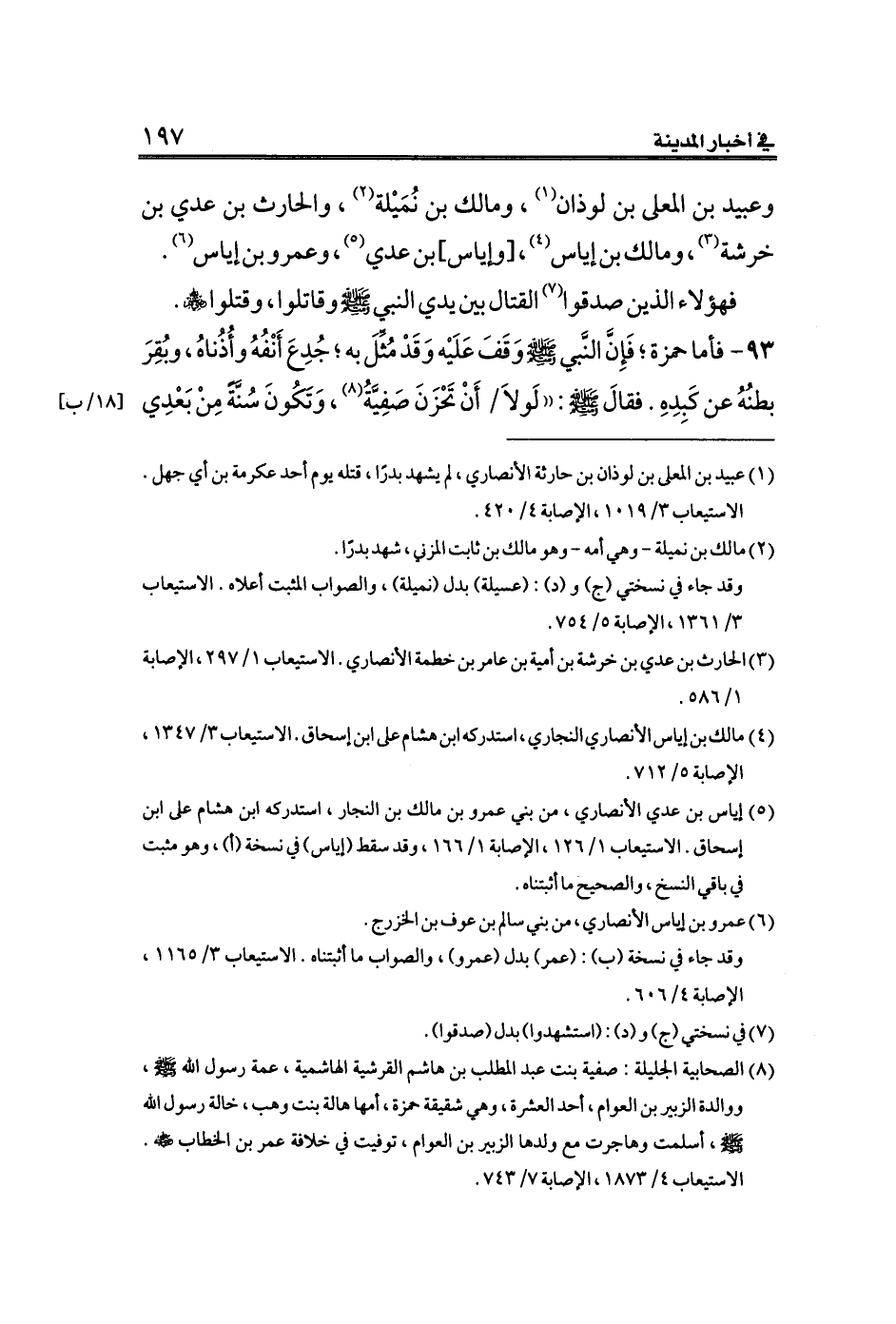 (¬٨) الصحابية الجليلة: صفية بنت عبد المطلب بن هاشم القرشية الهاشمية، عمة رسول الله صلى الله عليه وسلم، ووالدة الزبير بن العوام، أحد العشرة، وهي شقيقة حمزة، أمها هالة بنت وهب، خالة رسول الله صلى الله عليه وسلم، أسلمت وهاجرت مع ولدها الزبير بن العوام، توفيت في خلافة عمر بن الخطاب - رضي الله عنه -. الاستيعاب ٤/ ١٨٧٣، الإصابة ٧/ ٧٤٣.