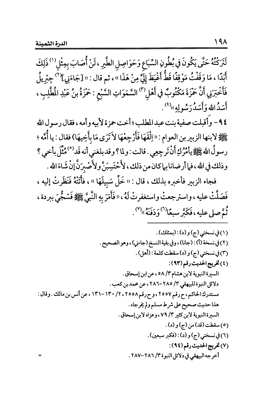 ٩٤ - وأقبلت صفية بنت عبد المطلب؛ أخت حمزة لأبيه وأمه، فقال رسول الله صلى الله عليه وسلم لابنها الزبير بن العوام: ((اِلْقَهَا فَأَرْجِعْهَا لَا تَرَى مَا بِأَخِيهَا) فقال: يا أُمَّه؛ رسولُ الله صلى الله عليه وسلم يأمُرُكِ أَنْ تَرجِعِي. قالت: ولما؟ وقد بلغني أنه قَد (¬٥) مُثِّلَ بأخي؟ وذلك في الله، فما أرضانا بما كان من ذلك، لأَحْتَسِبَنَّ ولأَصْبِرَنَّ إنْ شَاءَ الله.