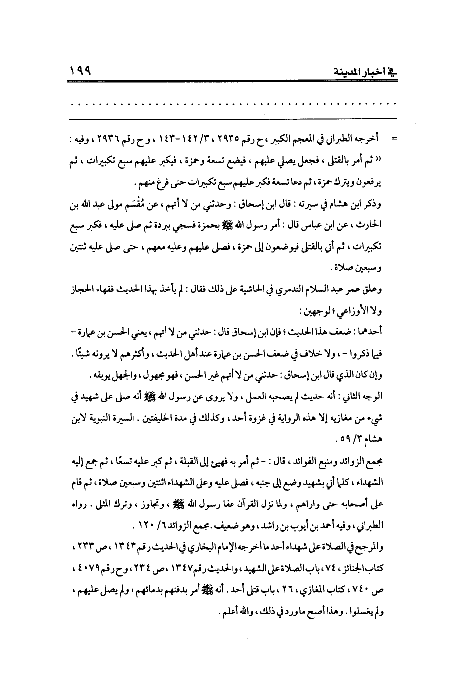 الوجه الثاني: أنه حديث لم يصحبه العمل، ولا يروى عن رسول الله صلى الله عليه وسلم أنه صلى على شهيد في شيء من مغازيه إلا هذه الرواية في غزوة أحد، وكذلك في مدة الخليفتين. السيرة النبوية لابن هشام ٣/ ٥٩.