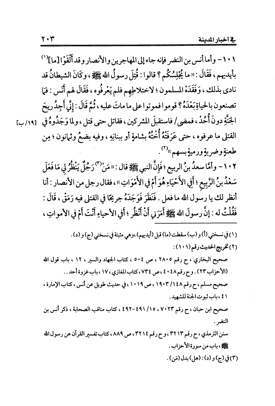 صحيح البخاري، ح رقم ٢٨٠٥، ص ٥٠٤، كتاب الجهاد والسير، ١٢، باب قول الله (الأحزاب ٢٣). و ح رقم ٤٠٤٨، ص ٧٣٤، كتاب المغازي، ١٧، باب غزوة أحد ..