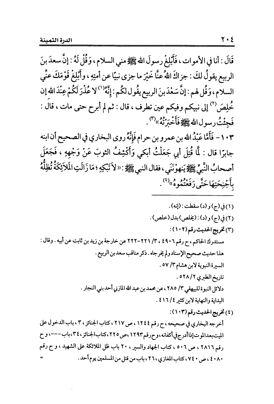 ١٠٣ - فَأَمَّا عَبْدُ الله بن عمرو بن حرام فَإِنَّهُ روى البخاري في الصحيح أن ابنه جابرًا قال: لَمَّا قُتِلَ أبي جَعَلْتُ أبكي وَأَكْشِفُ الثوبَ عَنْ وَجْهِهِ، فَجَعَلَ أصحابُ النَّبيِّ - صلى الله عليه وسلم - يَنهوْنَنَي، فقال النبي الله صلى الله عليه وسلم: ((لَا تَبْكِهِ؛ مَا زَالَتِ المَلَائِكَةُ تُظِلُّهُ بِأَجْنِحَتِهَا حَتَّى رَفَعْتُمُوهُ)) (¬٤).