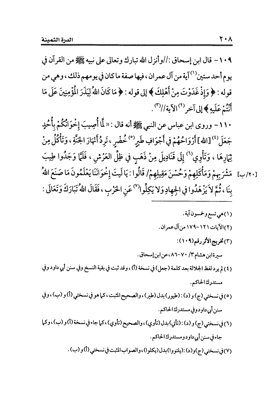 ١٠٩ - قال ابن إسحاق://وأنزل الله تبارك وتعالى على نبيه - صلى الله عليه وسلم - من القرآن في يوم أحد ستين (¬١) آية من آل عمران، فيها صفة ما كان في يومهم ذلك، وهي من قوله: {وَإِذْ غَدَوْتَ مِنْ أَهْلِكَ} إلى قوله: {مَا كَانَ اللهُ لِيَذَرَ المُؤْمِنِينَ عَلَى مَا أَنْتُمْ عَلَيهِ} إلى آخر (¬٢) الآية// (¬٣).