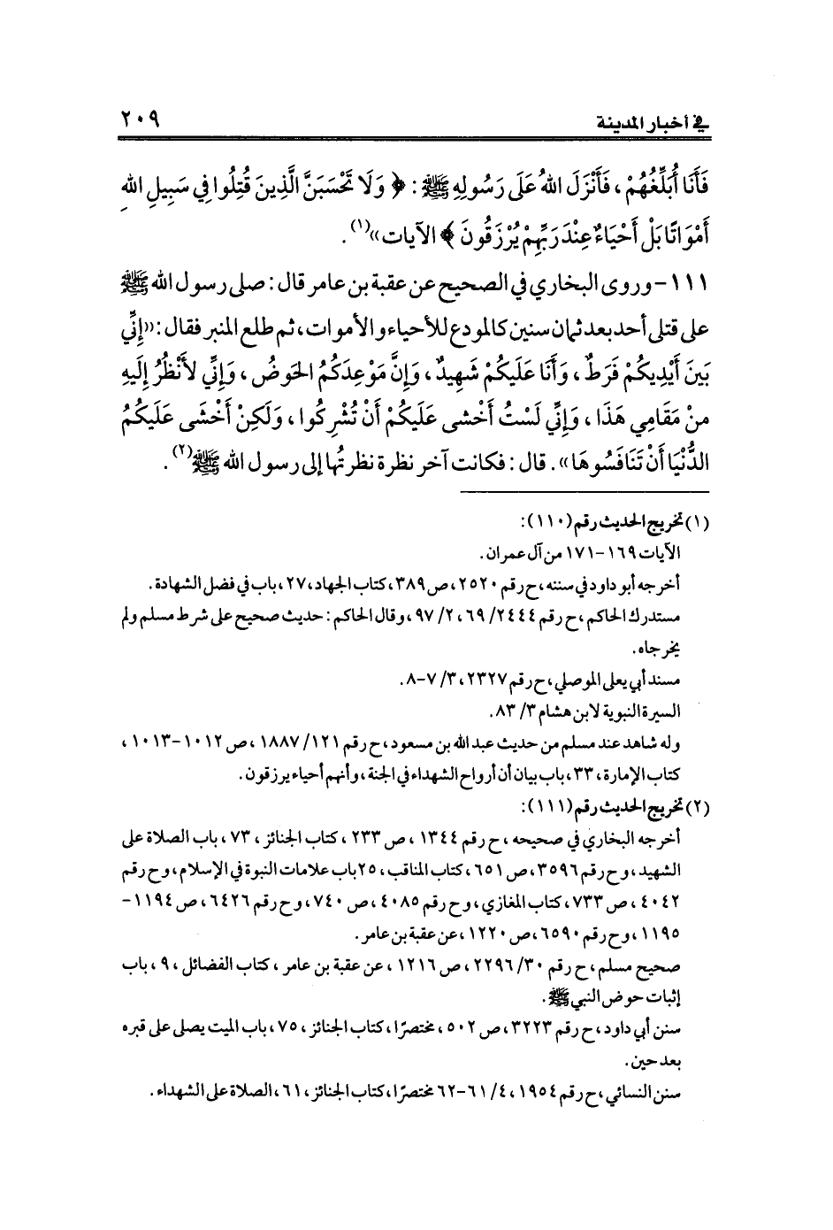 أخرجه البخاري في صحيحه، ح رقم ١٣٤٤، ص ٢٣٣، كتاب الجنائز، ٧٣، باب الصلاة على الشهيد، و ح رقم ٣٥٩٦، ص ٦٥١، كتاب المناقب، ٢٥ باب علامات النبوة في الإسلام، و ح رقم ٤٠٤٢، ص ٧٣٣، كتاب المغازي، و ح رقم ٤٠٨٥، ص ٧٤٠، و ح رقم ٦٤٢٦، ص ١١٩٤ - ١١٩٥، و ح رقم ٦٥٩٠، ص ١٢٢٠، عن عقبة بن عامر.