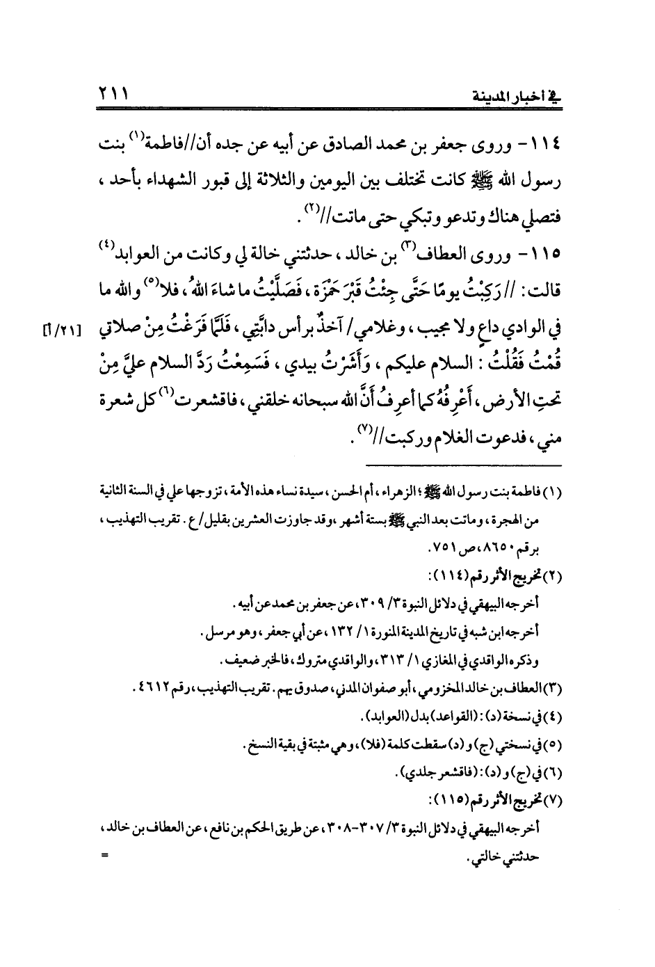 ١١٤ - وروى جعفر بن محمد الصادق عن أبيه عن جده أن//فاطمة (¬١) بنت رسول الله صلى الله عليه وسلم كانت تختلف بين اليومين والثلاثة إلى قبور الشهداء بأحد، فتصلي هناك وتدعو وتبكي حتى ماتت// (¬٢).