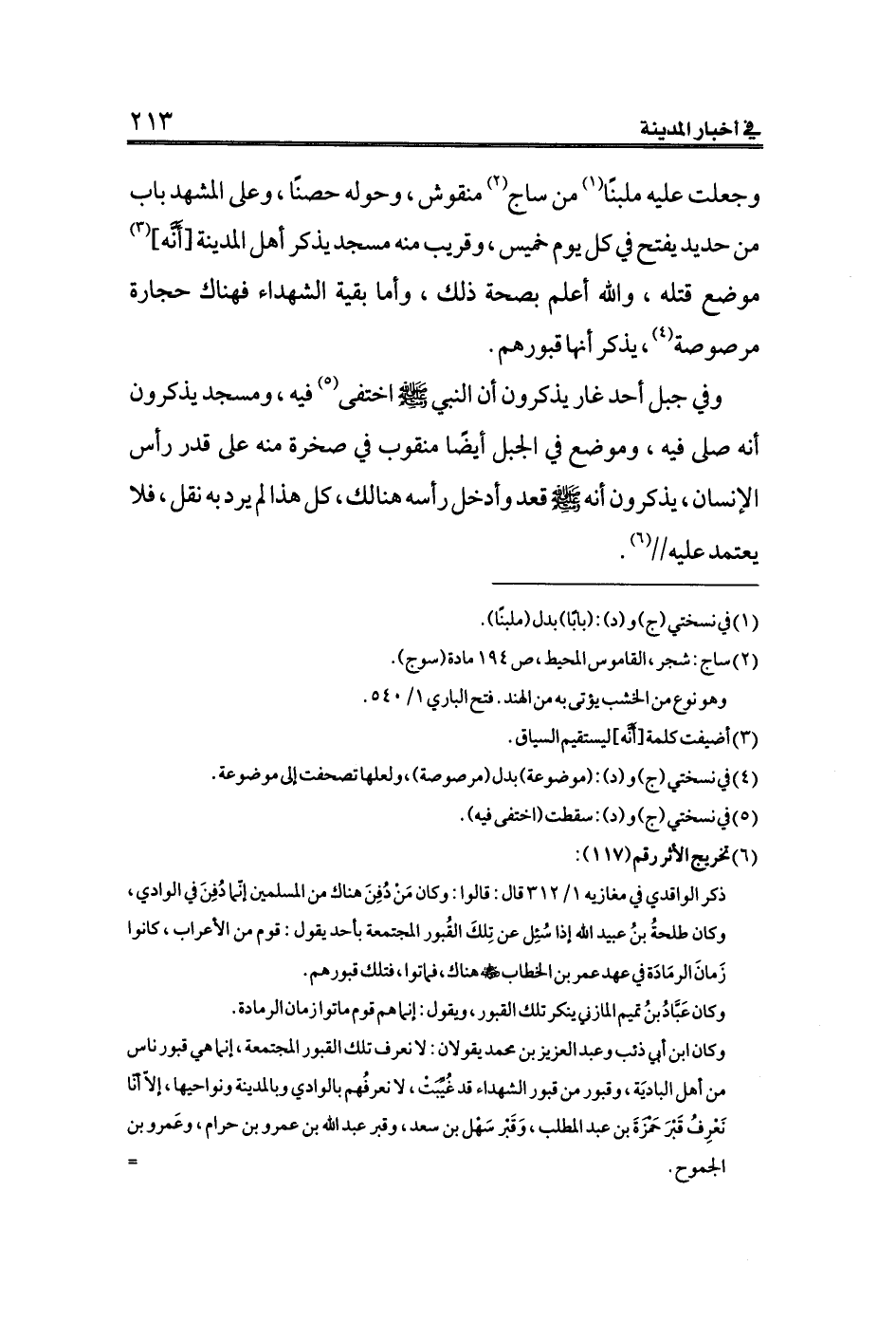 وكان ابن أبي ذئب وعبد العزيز بن محمد يقولان: لا نعرف تلك القبور المجتمعة، إنما هي قبور ناس من أهل الباديَة، وقبور من قبور الشهداء قد غُيِّبَتْ، لا نعرفُهم بالوادي وبالمدينة ونواحيها، إلاّ أنّا نَعْرِفُ قَبْرَ حَمْزَةَ بن عبد المطلب، وَقَبْر سَهْل بن سعد، وقبر عبد الله بن عمرو بن حرام، وعَمرو بن الجموح ......................... =