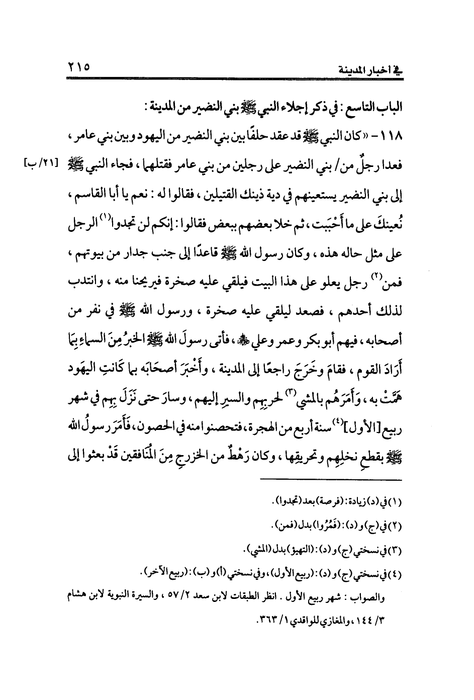 ١١٨ - ((كان النبي الله صلى الله عليه وسلم قد عقد حلفًا بين بني النضير من اليهود وبين بني عامر، فعدا رجلٌ من [٢١/ب] بني النضير على رجلين من بني عامر فقتلهما، فجاء النبي الله صلى الله عليه وسلم إلى بني النضير يستعينهم في دية ذينك القتيلين، فقالوا له: نعم يا أبا القاسم، نُعينكَ على ما أَحْبَبت، ثم خلا بعضهم ببعض فقالوا: إنكم لن تجدوا (¬١) الرجل على مثل حاله هذه، وكان رسول الله صلى الله عليه وسلم قاعدًا إلى جنب جدار من بيوتهم، فمن (¬٢) رجل يعلو على هذا البيت فيلقي عليه صخرة فيريحنا منه، وانتدب لذلك أحدهم، فصعد ليلقي عليه صخرة، ورسول الله صلى الله عليه وسلم في نفر من أصحابه، فيهم أبو بكر وعمر وعلي - رضي الله عنهم -، فأتى رسولَ الله صلى الله عليه وسلم الخبرُ مِنَ السماءِ بِمَا أَرَادَ القوم، فقامَ وخَرَجَ راجعًا إلى المدينة، وأَخْبَرَ أصحَابَه بما كَانتِ اليهَود هَمَّتْ به، وَأَمَرَهُم بالمشي (¬٣) لحربِهِم والسيرِ إليهم، وسارَ حتى نَزَلَ بِهِم في شهر ربيع [الأول] (¬٤) سنة أربع من الهجرة، فتحصنوا منه في الحصون، فَأَمَرَ رسولُ الله صلى الله عليه وسلم بقطعِ نخلِهِم وتحريقِها، وكان رَهْطٌ من الخزرجِ مِنَ المُنَافقين قَدْ بعثوا إلى
