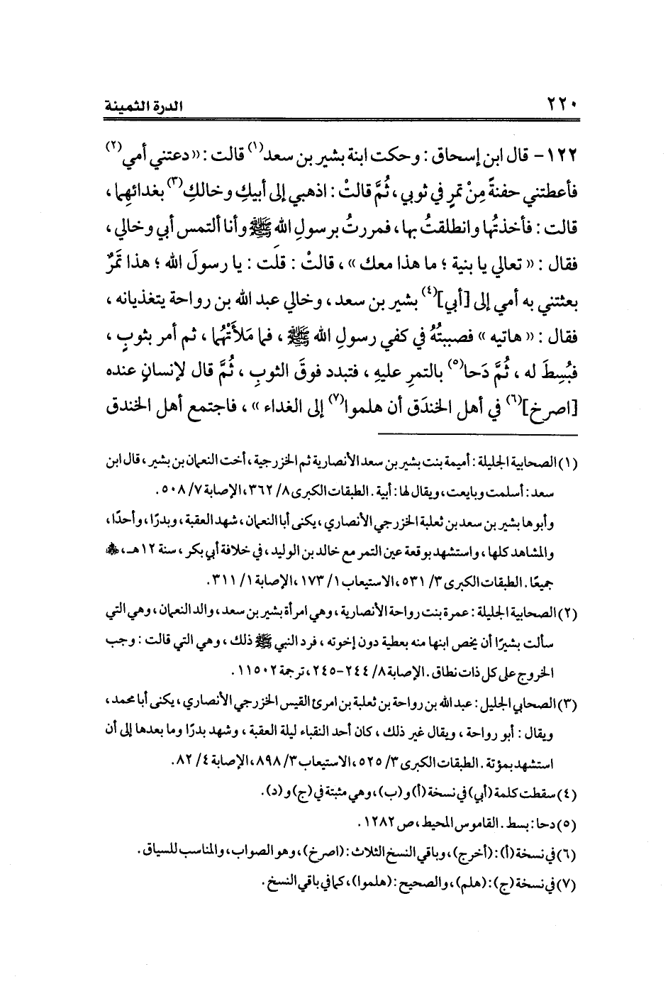 ١٢٢ - قال ابن إسحاق: وحكت ابنة بشير بن سعد (¬١) قالت: ((دعتني أمي (¬٢) فأعطتني حفنةً مِنْ تمرٍ في ثوبي، ثُمَّ قالتْ: اذهبي إلى أبيكِ وخالكِ (¬٣) بغدائهِما، قالت: فأخذتُها وانطلقتُ بها، فمررتُ برسولِ اللهِ - صلى الله عليه وسلم -وأنا ألتمس أبي وخالي، فقال: ((تعالي يا بنية؛ ما هذا معك))، قالتْ: قلت: يا رسولَ الله؛ هذا تَمرٌ بعثتني به أمي إلى [أبي] (¬٤) بشير بن سعد، وخالي عبد الله بن رواحة يتغذيانه، فقال: ((هاتيه)) فصببتُهُ في كفي رسولِ الله - صلى الله عليه وسلم -، فما مَلأَتْهُما، ثم أمر بثوبٍ، فبُسِطَ له، ثُمَّ دَحا (¬٥) بالتمرِ عليهِ، فتبدد فوقَ الثوبِ، ثُمَّ قال لإنسانٍ عنده [اصرخ] (¬٦) في أهل الخندَق أن هلموا (¬٧) إلى الغداء))، فاجتمع أهل الخندق