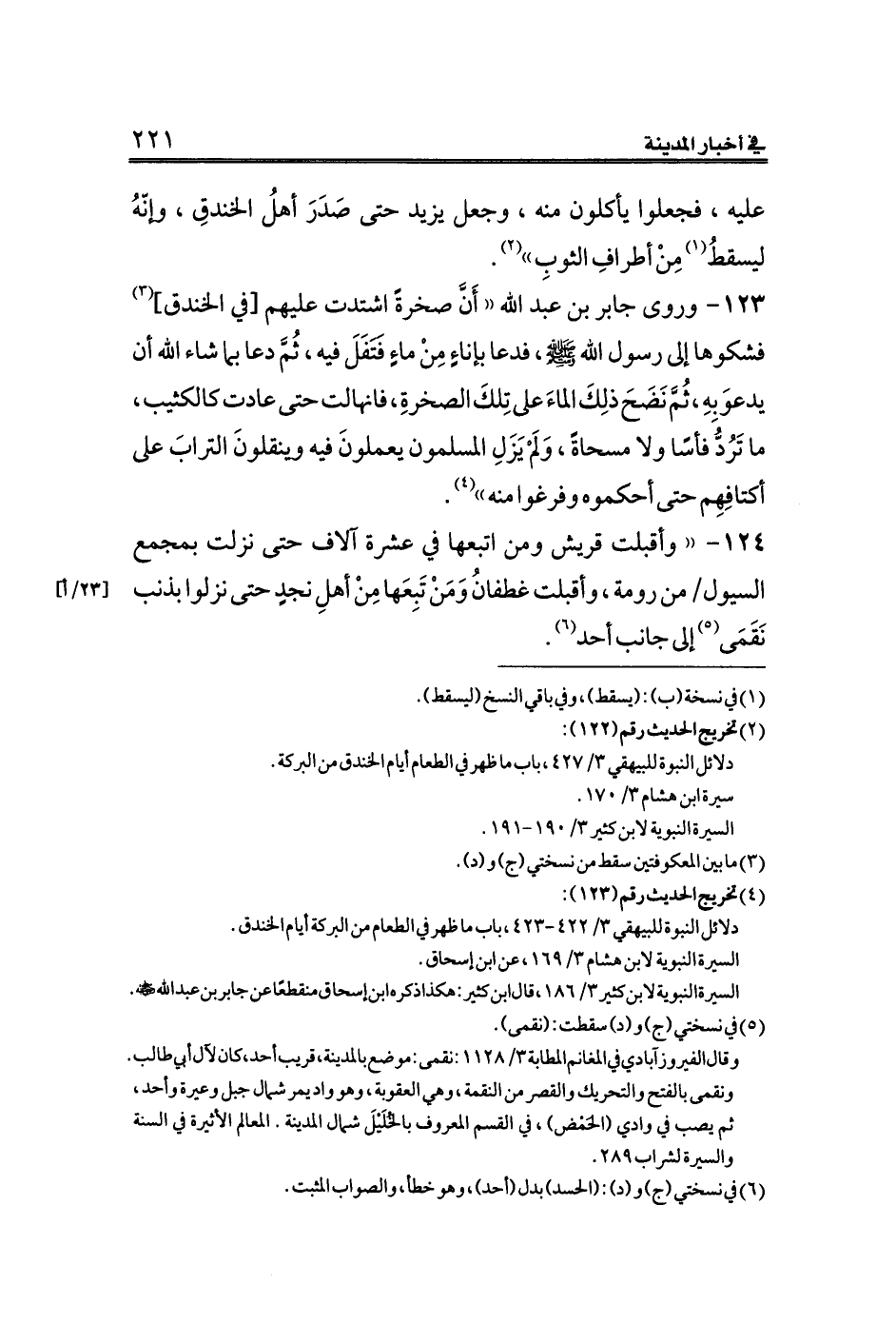 ١٢٣ - وروى جابر بن عبد الله ((أَنَّ صخرةً اشتدت عليهم [في الخندق] (¬٣) فشكوها إلى رسول الله صلى الله عليه وسلم، فدعا بإناءٍ مِنْ ماءٍ فَتَفَلَ فيه، ثُمَّ دعا بما شاء الله أن يدعوَ بِهِ، ثُمَّ نَضَحَ ذلِكَ الماءَ على تِلكَ الصخرةِ، فانهالت حتى عادت كالكثيب، ما تَرُدُّ فأسًا ولا مسحاةً، وَلَمْ يَزَلِ المسلمون يعملونَ فيه وينقلونَ الترابَ على أكتافِهِم حتى أحكموه وفرغوا منه)) (¬٤).