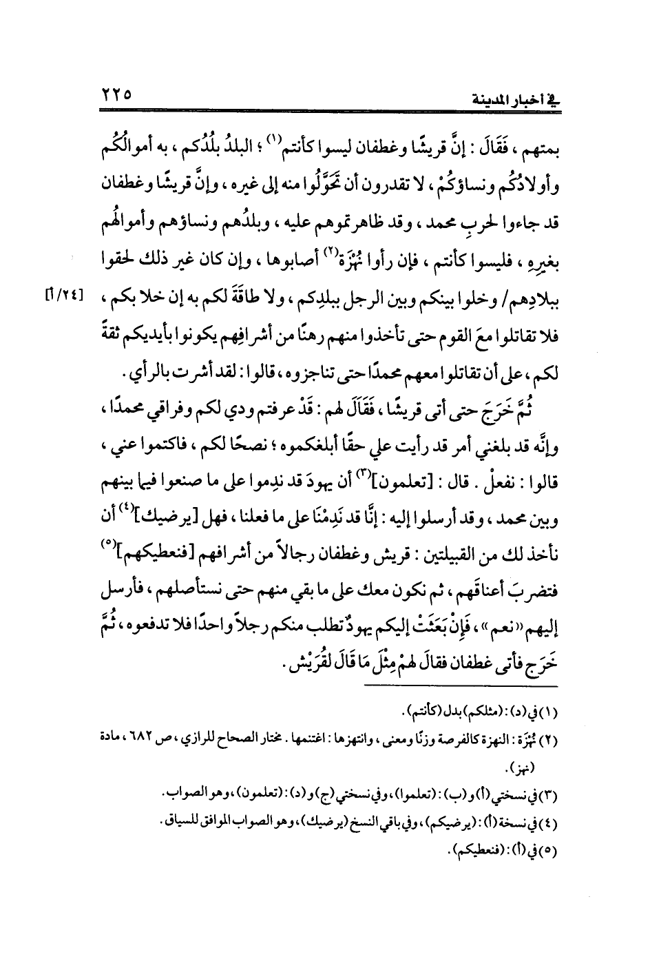 بمتهم، فَقَالَ: إنَّ قريشًا وغطفان ليسوا كأنتم (¬١)؛ البلدُ بلُدُكم، به أموالُكُم وأولادُكُم ونساؤكُمْ، لا تقدرون أن تَحَوَّلُوا منه إلى غيره، وإنَّ قريشًا وغطفان قد جاءوا لحربِ محمد، وقد ظاهرتموهم عليه، وبلدُهم ونساؤهم وأموالُهم بغيرِهِ، فليسوا كأنتم، فإن رأوا نُهْزَة (¬٢) أصابوها، وإن كان غير ذلك لحقوا ببلادِهم [٢٤/أ] وخلوا بينكم وبين الرجل ببلدِكم، ولا طاقَةَ لكم به إن خلا بكم، فلا تقاتلوا معَ القوم حتى تأخذوا منهم رهنًا من أشرافِهم يكونوا بأيديكم ثقةً لكم، على أن تقاتلوا معهم محمدًا حتى تناجزوه، قالوا: لقد أشرت بالرأي.