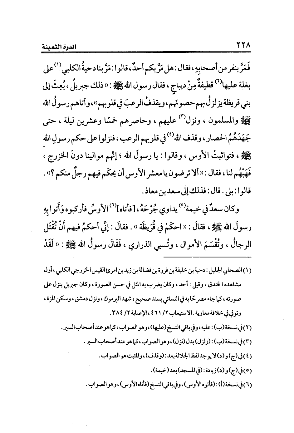 فَمَرَّ بنفر من أصحابِهِ، فقال: هل مَرَّ بكم أحدٌ، قالوا: مَرَّ بنا دحيةُ الكلبي (¬١) على بغلة عليها (¬٢) قطيفةٌ مِنْ ديباجٍ، فقال رسول الله صلى الله عليه وسلم: ((ذلك جبريلُ، بُعِثَ إلى بني قريظة يزلزلُ بهم حصونَهم، ويقذفُ الرعبَ في قلوبهم))، وأتاهم رسولُ الله صلى الله عليه وسلم والمسلمون، ونزل (¬٣) عليهم، وحاصرهم خمسًا وعشرين ليلة، حتى جَهَدَهُمُ الحصار، وقذف الله (¬٤) في قلوبهم الرعب، فنزلوا على حكم رسولِ اللهِ - صلى الله عليه وسلم -، فتواثبتْ الأوس، وقالوا: يا رسولَ الله؛ إنَّهم موالينا دونَ الخزرج، فَهَبْهُم لنا، فقال: ((ألا ترضون يا معشر الأوس أن يحكَم فيهم رجلٌ منكم؟)). قالوا: بلى. قال: فذلك إلى سعد بن معاذ.