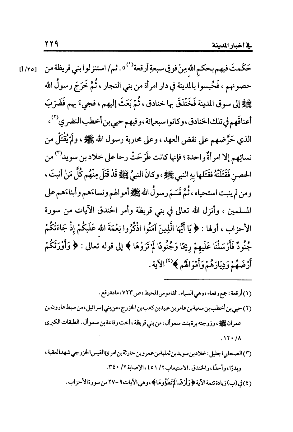 حَكَمتَ فيهم بحكمِ اللهِ مِنْ فوقِ سبعةِ أرقعة (¬١))). ثم [٢٥/أ] استنزلوا بني قريظة من حصونهم، فَحُبسوا بالمدينة في دار امرأة من بني النجار، ثُمَّ خَرَجَ رسولُ الله صلى الله عليه وسلم إلى سوق المدينة فَخَنْدَقَ بها خنادق، ثُمّ بَعَثَ إليهم، فجيءَ بهم فَضَرَبَ أعناقَهم في تلك الخنادق، وكانوا سبعمائة، وفيهم حيي بن أخطب النضري (¬٢)، الذي حَرَّضهم على نقض العهد، وعلى محاربة رسول الله صلى الله عليه وسلم، ولَمْ يُقْتَلْ من نسائِهم إلا امرأةٌ واحدة؛ فإنها كانت طَرَحَتْ رحا على خلاد بن سويد (¬٣) من الحصنِ فَقَتَلَتْهُ فقَتَلها بِهِ النبي صلى الله عليه وسلم، وكانَ النبيُ - صلى الله عليه وسلم - قَدْ قَتَلَ مِنْهُم كُلَّ مَنْ أنبتَ، ومن لم ينبت استحياه، ثُمَّ قَسَمَ رسولُ الله صلى الله عليه وسلم أموالهم ونساءَهم وأبناءَهم على المسلمين، وأنزل الله تعالى في بني قريظة وأمر الخندق الآيات من سورة الأحزاب، أولها: {يَا أَيُّهَا الَّذِينَ آمَنُوا اذْكُرُوا نِعْمَةَ اللهِ عَلَيكُمْ إِذْ جَاءَتْكُمْ جُنُودٌ فَأَرْسَلْنَا عَلَيهِمْ رِيحًا وَجُنُودًا لَمْ تَرَوْهَا} إلى قوله تعالى: {وَأَوْرَثَكُمْ أَرْضَهُمْ وَدِيَارَهُمْ وَأَمْوَالَهُم} (¬٤) الآية.