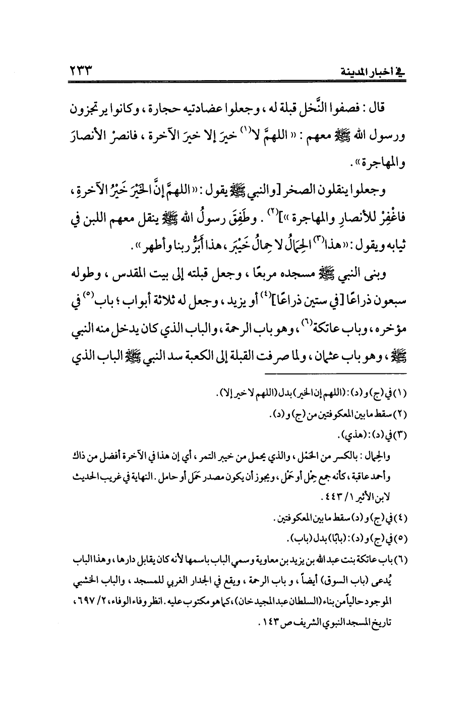 وبنى النبي الله صلى الله عليه وسلم مسجده مربعًا، وجعل قبلته إلى بيت المقدس، وطوله سبعون ذراعًا [في ستين ذراعًا] (¬٤) أو يزيد، وجعل له ثلاثة أبواب؛ باب (¬٥) في مؤخره، وباب عاتكة (¬٦)، وهو باب الرحمة، والباب الذي كان يدخل منه النبي صلى الله عليه وسلم، وهو باب عثمان، ولما صرفت القبلة إلى الكعبة سد النبي الله صلى الله عليه وسلم الباب الذي