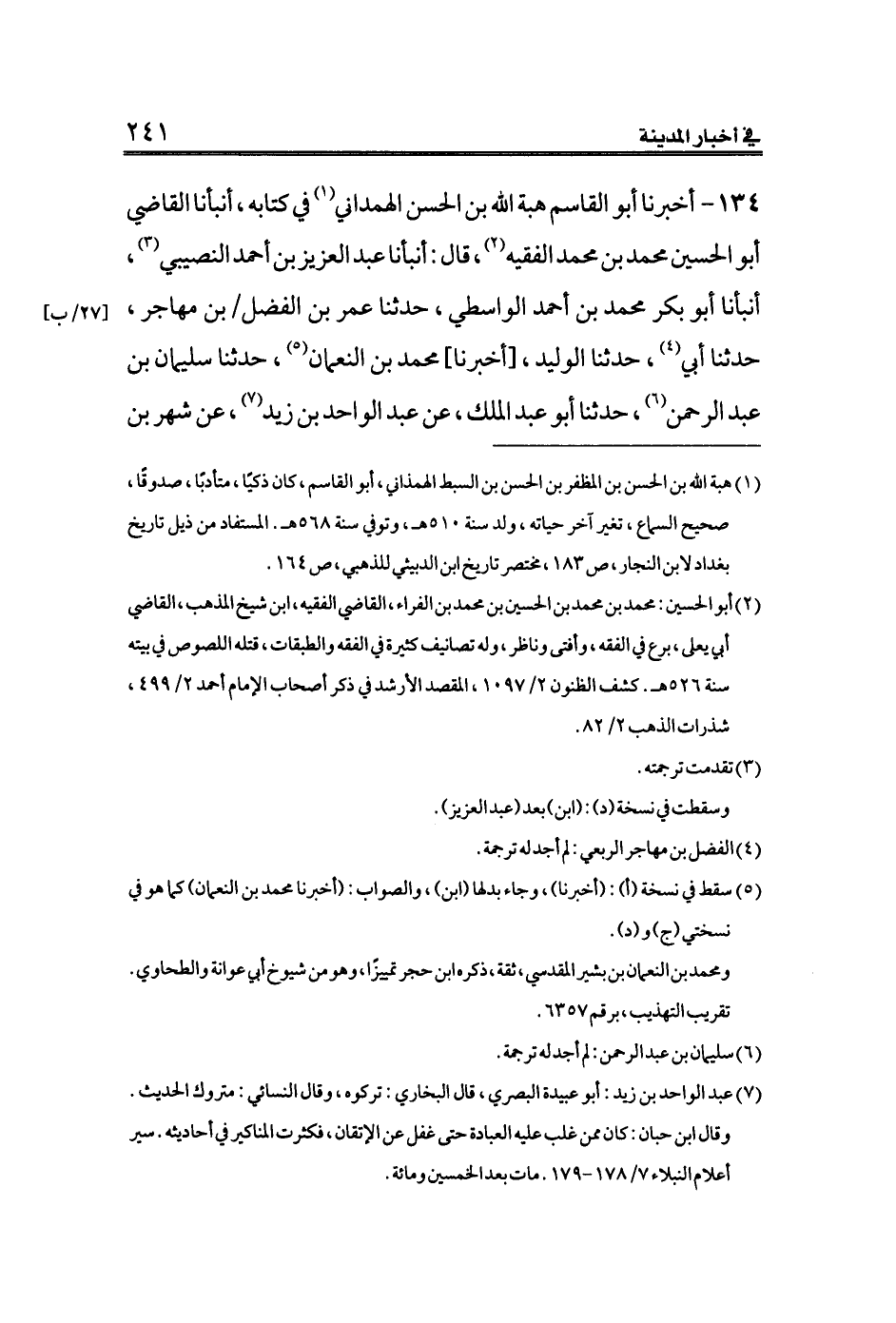 (¬١) هبة الله بن الحسن بن المظفر بن الحسن بن السبط الهمذاني، أبو القاسم، كان ذكيًا، متأدبًا، صدوقًا، صحيح السماع، تغير آخر حياته، ولد سنة ٥١٠ هـ، وتوفي سنة ٥٦٨ هـ. المستفاد من ذيل تاريخ بغداد لابن النجار، ص ١٨٣، مختصر تاريخ ابن الدبيثي للذهبي، ص ١٦٤.
