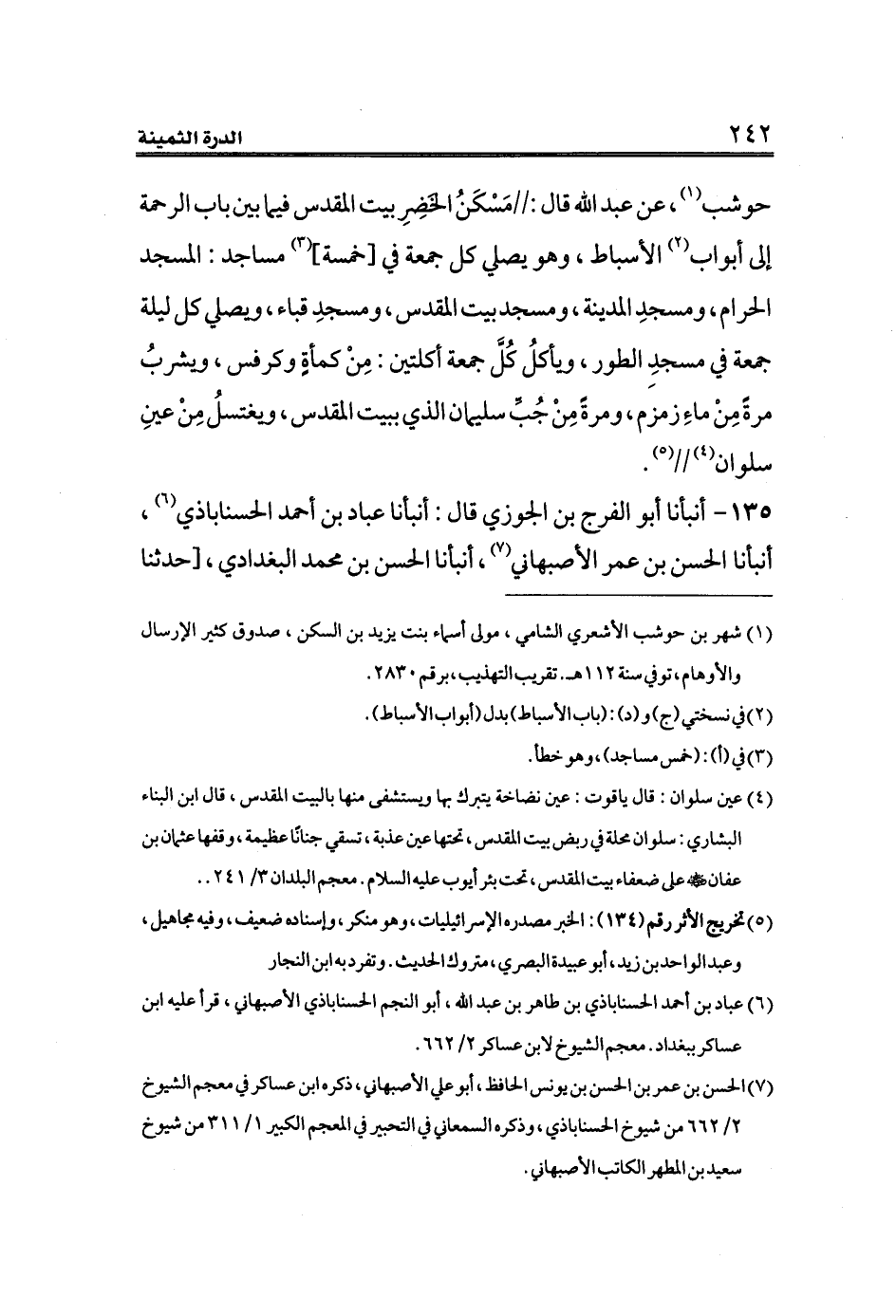 حوشب (¬١)، عن عبد الله قال://مَسْكَنُ الخَضِرِ بيت المقدس فيما بين باب الرحمة إلى أبواب (¬٢) الأسباط، وهو يصلي كل جمعة في [خمسة] (¬٣) مساجد: المسجد الحرام، ومسجدِ المدينة، ومسجد بيت المقدس، ومسجدِ قباء، ويصلي كل ليلة جمعة في مسجدِ الطور، ويأكلُ كُلَّ جمعة أكلتين: مِنْ كمأةٍ وكرفس، ويشربُ مرةً مِنْ ماءِ زمزم، ومرةً مِنْ جُبِّ سليمان الذي ببيت المقدس، ويغتسلُ مِنْ عينِ سلوان (¬٤) // (¬٥).