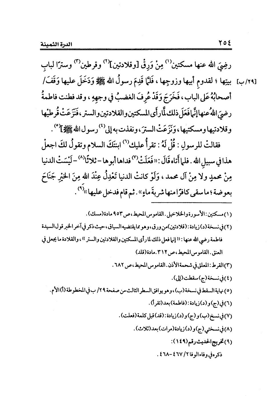 (¬٢) في نسخة (د) زيادة: (قلادتين) من ورق، وهو مما يقتضيه السياق، حيث ذكر في آخر الخبر قول السيدة فاطمة رضي الله عنها: ((إنما فعل ذلك لما رأى المسكتين والقلادتين والستر))، والقلادة ما يجعل في العنق. القاموس المحيط، ص ٣١٢.مادة (قلد)