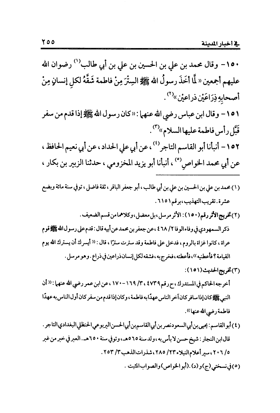١٥٢ - أنبأنا أبو القاسم التاجر (¬٤)، عن أبي علي الحداد، عن أبي نعيم الحافظ، عن أبي محمد الخواصِ (¬٥)، أنبأنا أبو يزيد المخزومي، حدثنا الزبير بن بكار،