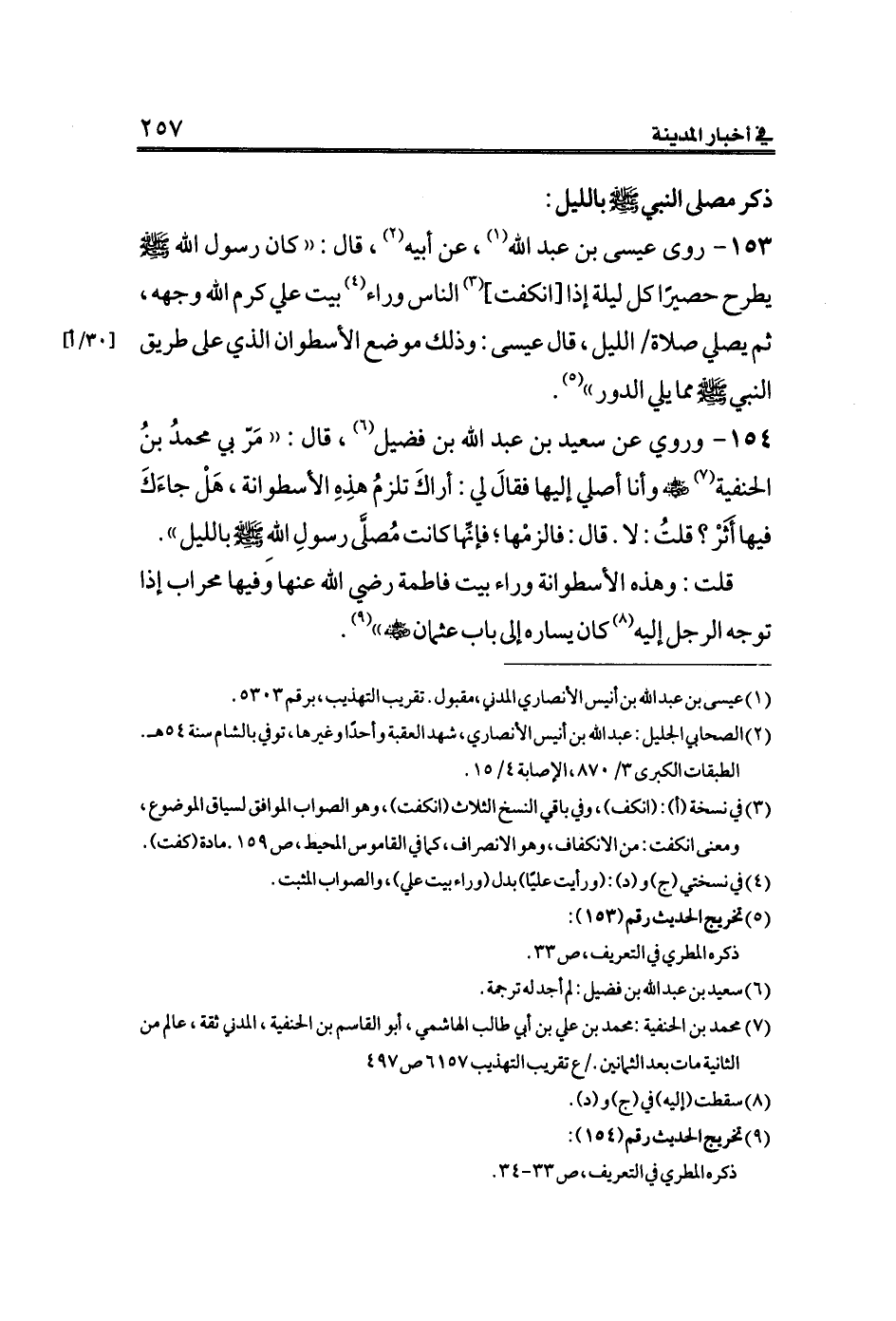 ١٥٣ - روى عيسى بن عبد الله (¬١)، عن أبيه (¬٢)، قال: ((كان رسول الله صلى الله عليه وسلم يطرح حصيرًا كل ليلة إذا [انكفت] (¬٣) الناس وراء (¬٤) بيت علي كرم الله وجهه، ثم يصلي صلاة [٣٠/أ] الليل، قال عيسى: وذلك موضع الأسطوان الذي على طريق النبي الله صلى الله عليه وسلم مما يلي الدور)) (¬٥).