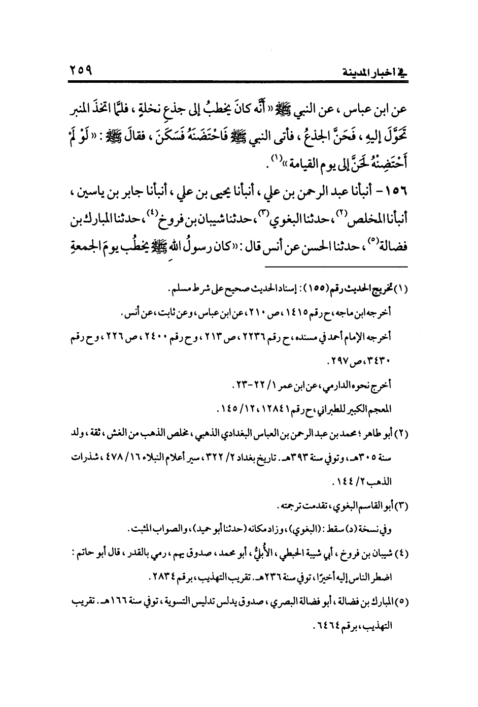 ١٥٦ - أنبأنا عبد الرحمن بن علي، أنبأنا يحيى بن علي، أنبأنا جابر بن ياسين، أنبأنا المخلص (¬٢)، حدثنا البغوي (¬٣)، حدثنا شيبان بن فروخ (¬٤)، حدثنا المبارك بن فضالة (¬٥)، حدثنا الحسن عن أنس قال: ((كان رسولُ اللهِ صلى الله عليه وسلم يخطُب يومَ الجمعةِ