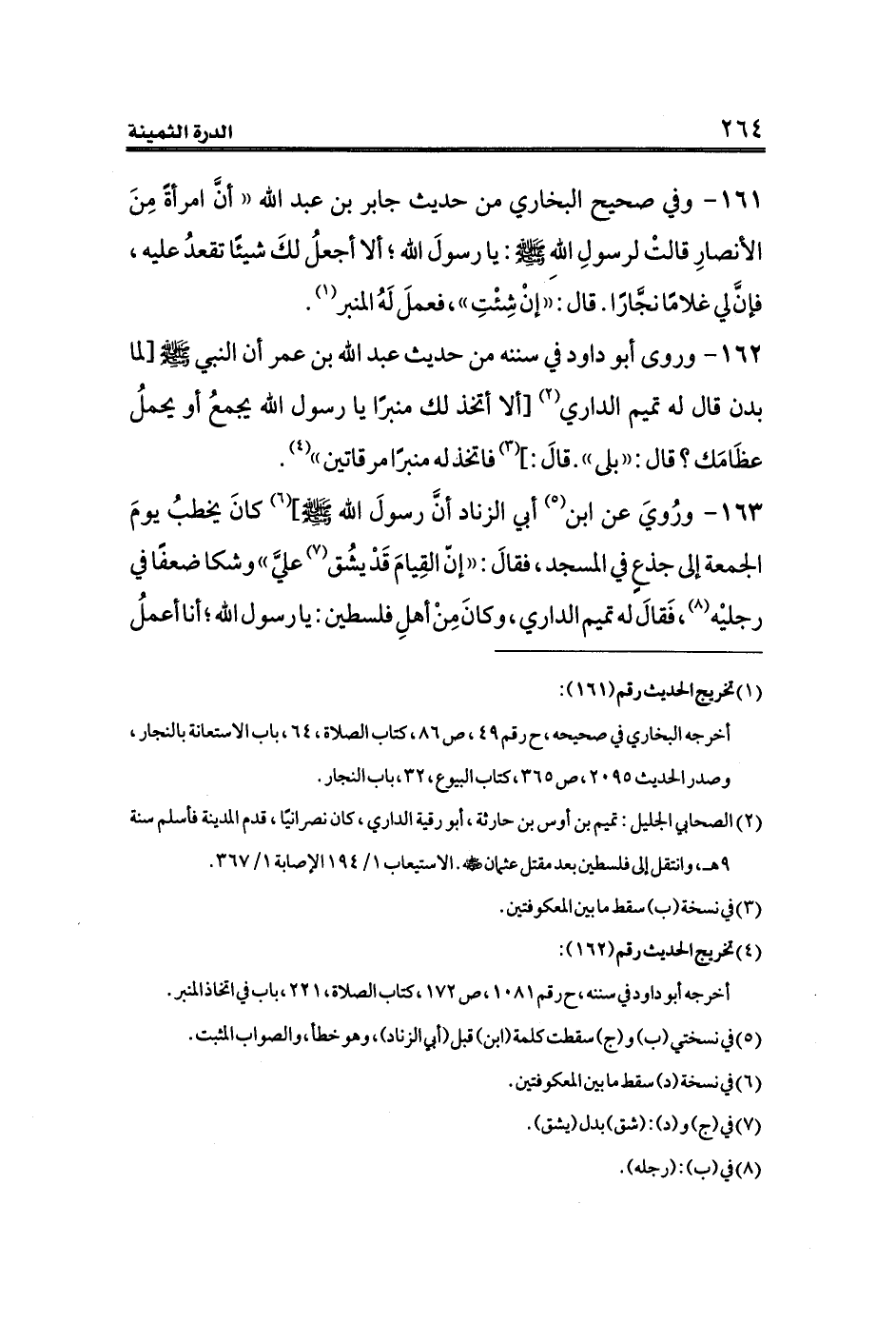 ١٦٣ - ورُويَ عن ابن (¬٥) أبي الزناد أنَّ رسولَ الله صلى الله عليه وسلم] (¬٦) كانَ يخطبُ يومَ الجمعة إلى جذعٍ في المسجد، فقالَ: ((إنّ القِيامَ قَدْ يشُق (¬٧) عليَّ)) وشكا ضعفًا في رجليْه (¬٨)، فَقالَ له تميم الداري، وكانَ مِنْ أهلِ فلسطين: يا رسول الله؛ أنا أعملُ