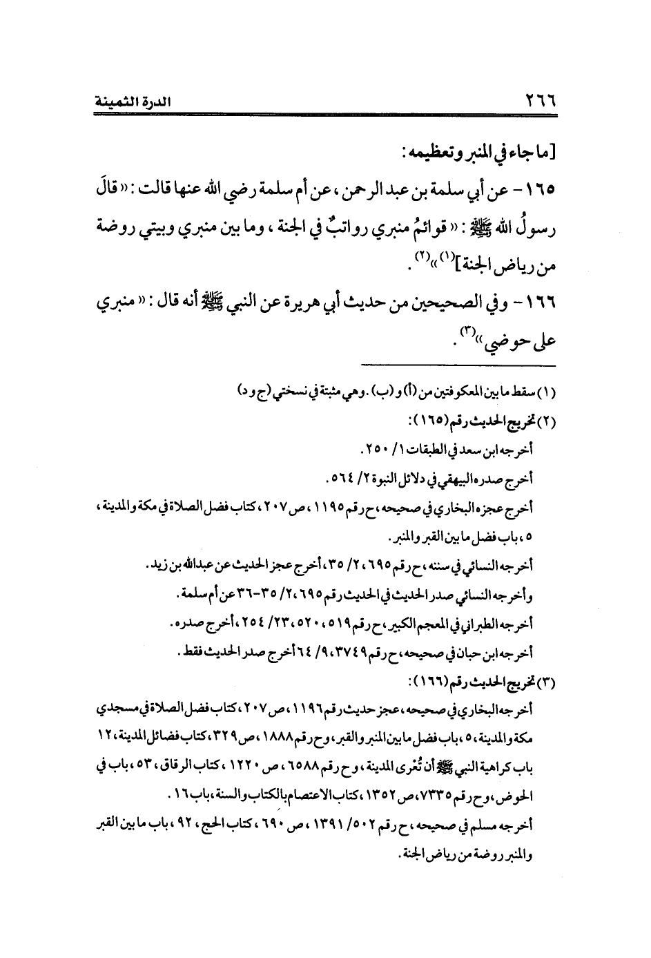 ١٦٥ - عن أبي سلمة بن عبد الرحمن، عن أم سلمة رضي الله عنها قالت: ((قالَ رسولُ الله صلى الله عليه وسلم: ((قوائمُ منبري رواتبٌ في الجنة، وما بين منبري وبيتي روضة من رياض الجنة] (¬١))) (¬٢).