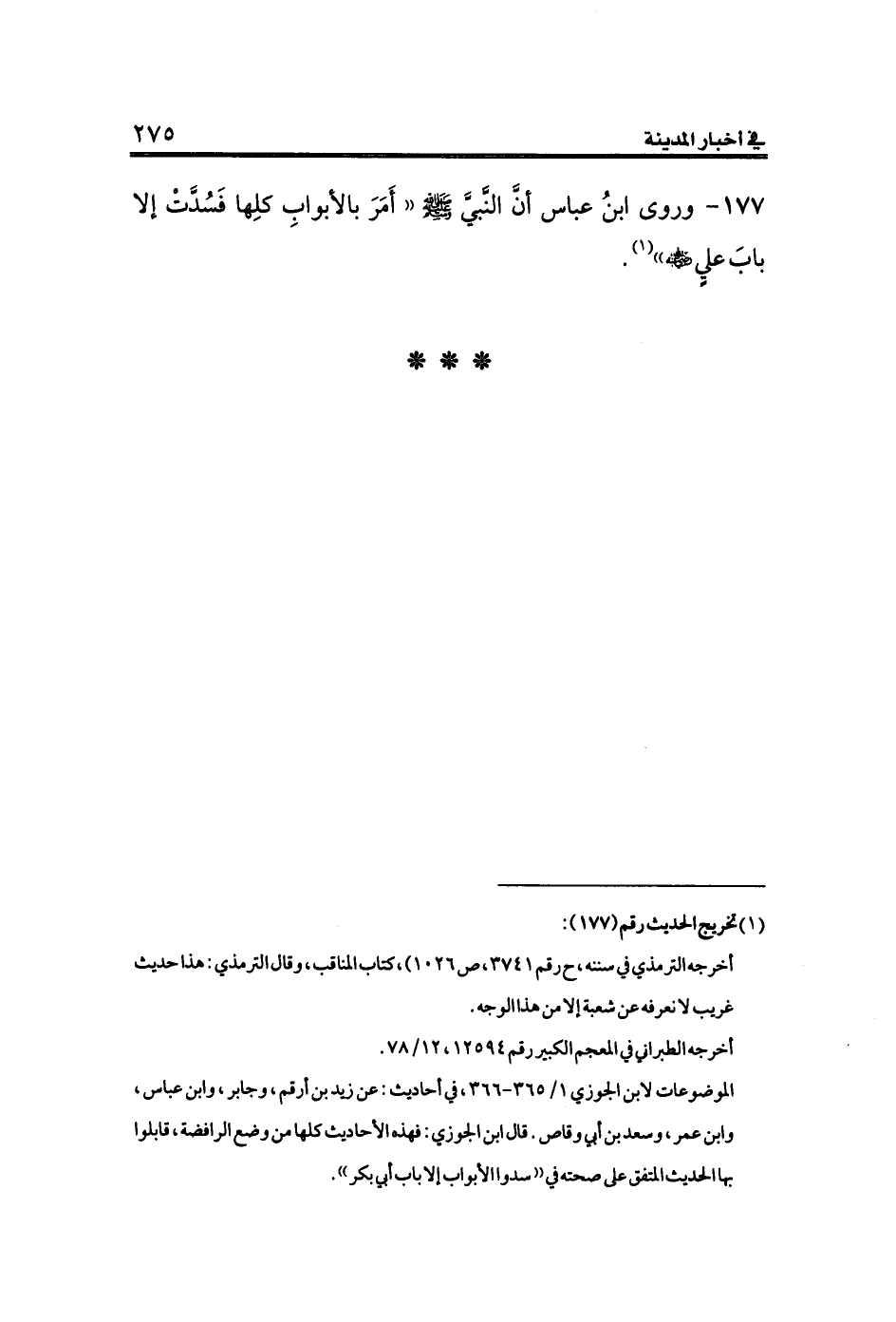 ١٧٧ - وروى ابنُ عباس أنَّ النَّبيَّ صلى الله عليه وسلم ((أَمَرَ بالأبوابِ كلِها فَسُدَّتْ إلا